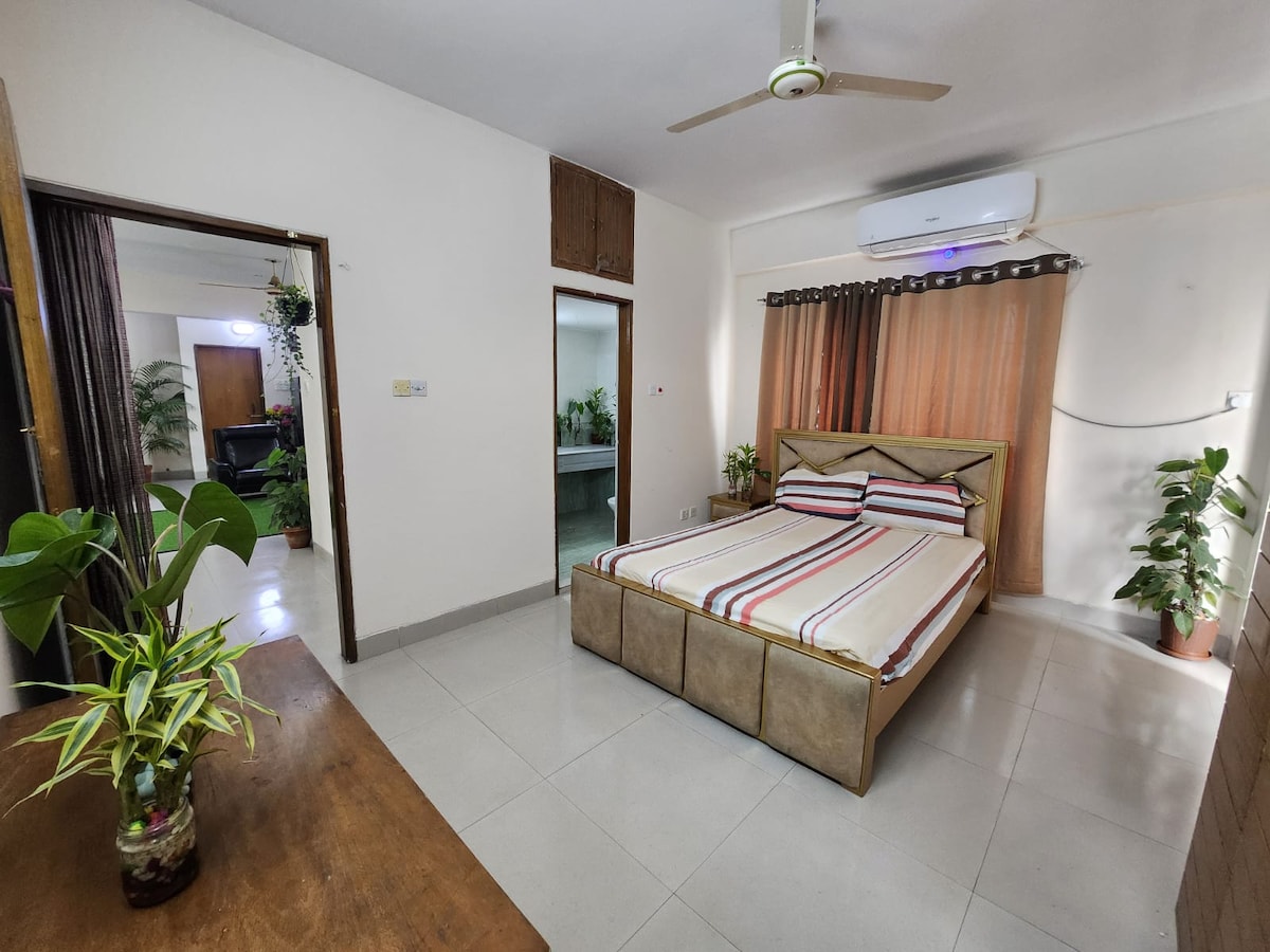 Esta acogedora casa en el cuarto piso combina comodidad y conveniencia con un dormitorio luminoso, un armario de pared, una sala de estar con TV, una sala de oración, una estación de trabajo y un comedor. La cocina incluye nevera, horno y filtro de agua HI-TECH para facilitar la vida. Elementos esenciales como el geiser, el wifi y el aire acondicionado tanto en el dormitorio como en la sala de estar garantizan la comodidad. Ubicado junto al outlet Gulshan Aarong y a poca distancia a pie de tiendas de alimentos, es perfecto para leer tranquilamente, trabajar desde casa o simplemente relajarse para un máximo de 2 personas.