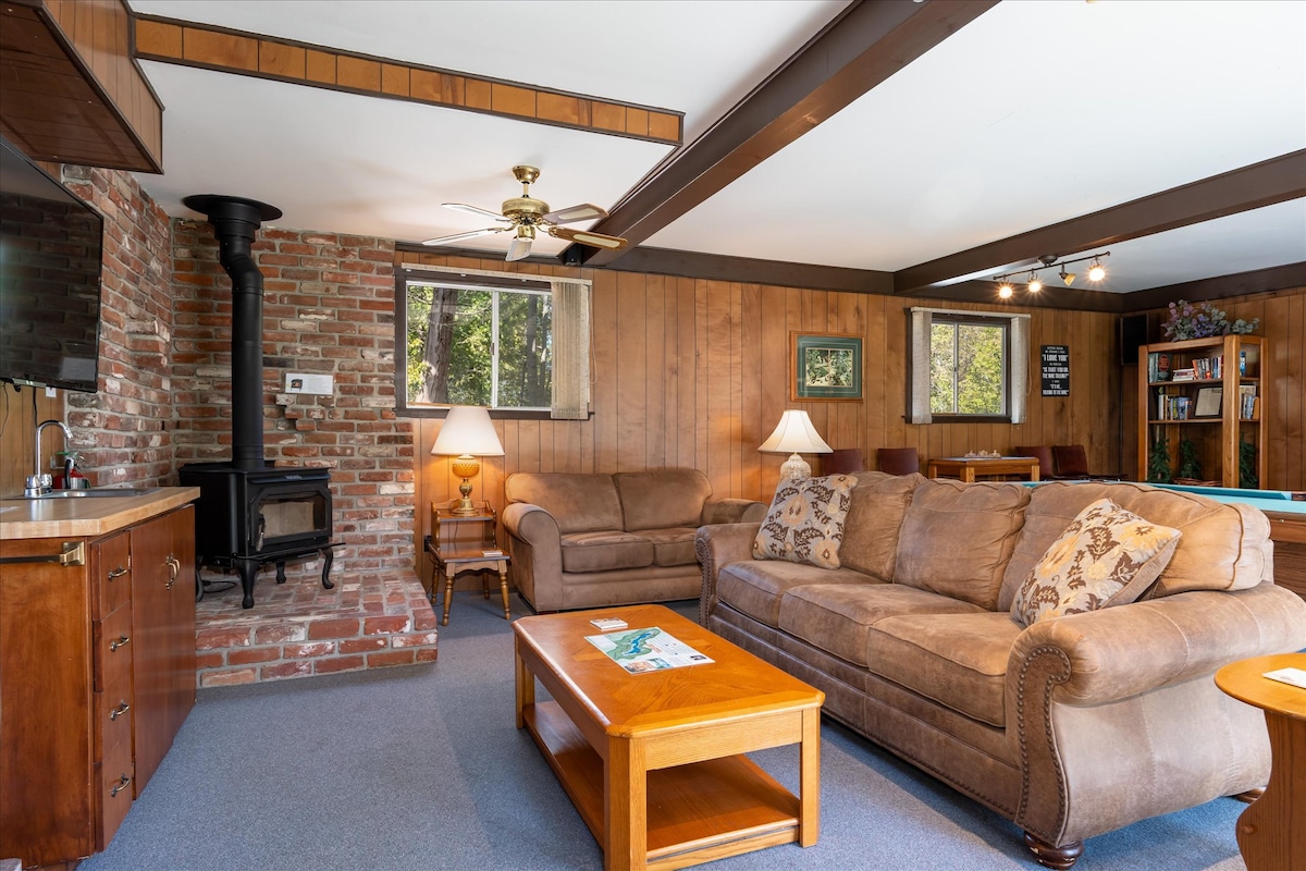 Centro de Willowcove con bote, un corto vecindario plano a pie hasta el mercado de Pines, Ducey's y tiendas. Hay un montón de estacionamiento para automóviles/remolque de barcos. No se permiten autocaravanas ni remolques de viaje. El muelle es un muelle privado de entrada con llave en Willow Cove, a un corto paseo de la colina. El alojamiento tiene un flujo de concepto abierto que se conecta a: cubierta delantera, entrada lateral y sala de juegos. Refrigerador de pantano para refrigeración y estufas de leña para calefacción adicional para el invierno. Barbacoa de propano, televisores inteligentes, mesa de billar, futbolín, libros, juegos y puzles. No se ADMITEN MASCOTAS.