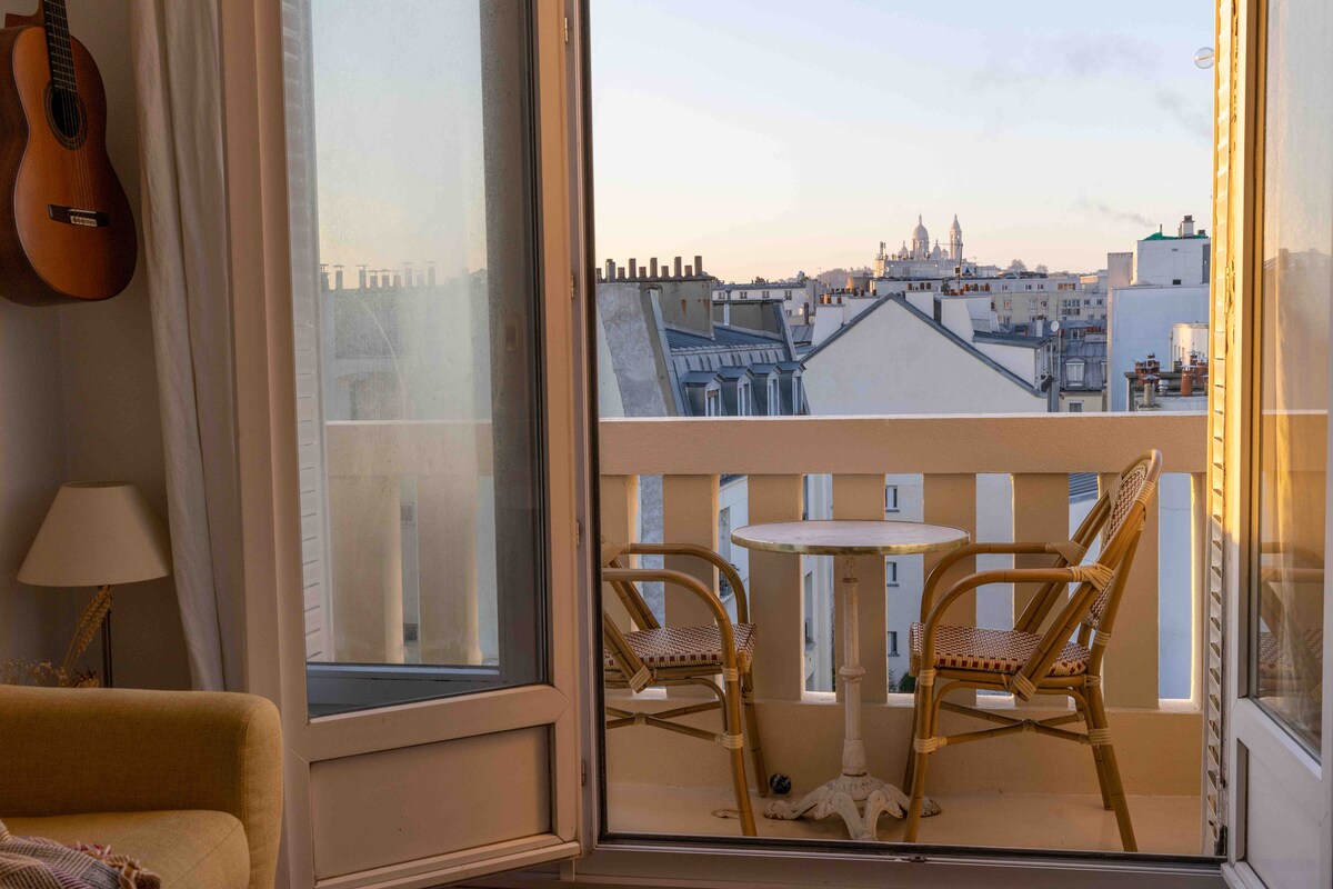 ¡Apartamento de excepción! Luminoso: 2 balcones con vistas despejada en los tejados de París y el Sagrado Corazón Tranquilo: en el último piso con ascensor, sin vecinos Idealmente situado a 50 metros del Canal Saint-Martin, a 5 minutos a pie de la Gare de l 'Est, a 15 minutos de Gare du Nord (directo desde los aeropuertos con el RER B) En 1 minuto a pie se encuentra en los muelles peatonales del canal, y puede terminar el día con una cena en el balcón frente al atardecer detrás del Sagrado Corazón