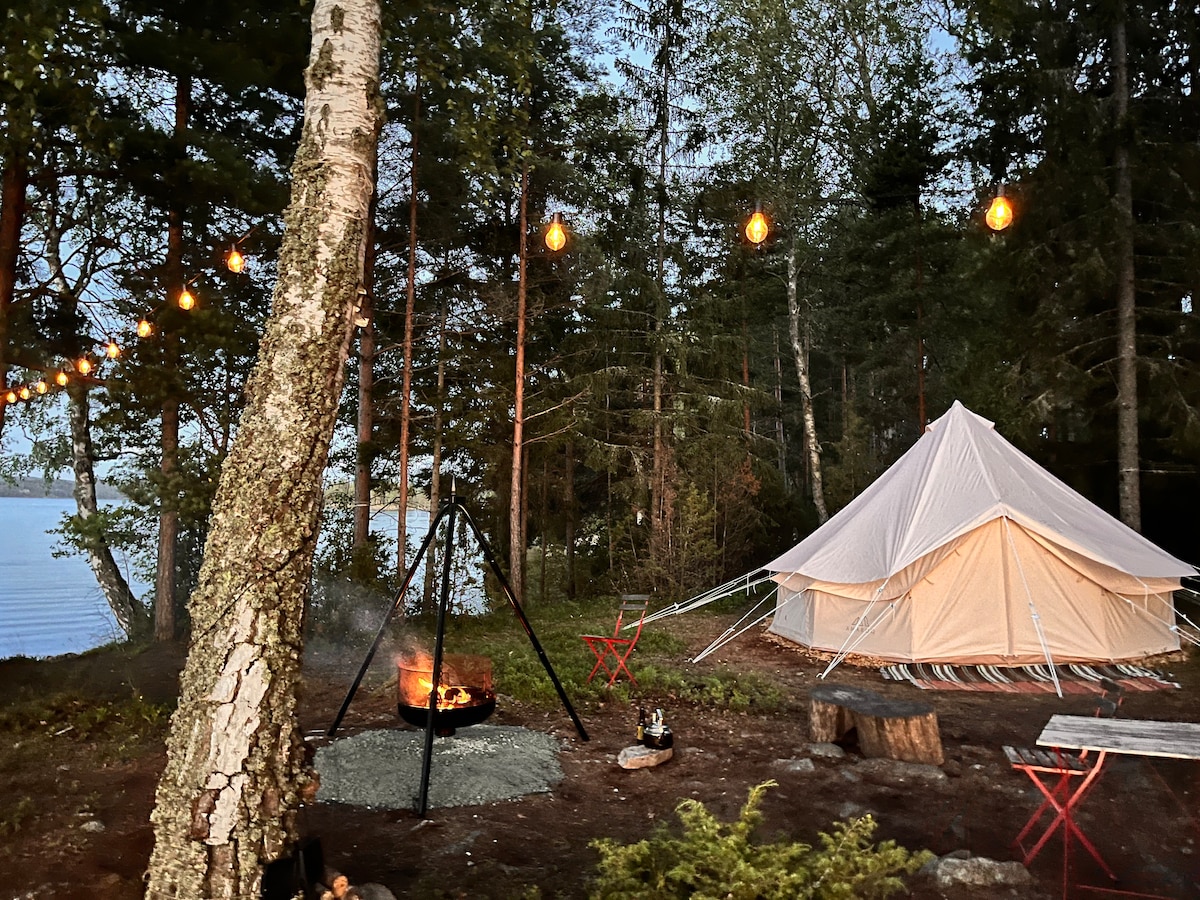 Disfruta de la profunda y silenciosa tranquilidad del bosque en una encantadora y espaciosa tienda de campaña con una estufa de leña y cómodos muebles. Incl. edredones/almohadas, excl. ropa de cama. Cocina en una chimenea rústica con una gran selección de utensilios y leña ilimitada. Hay acceso adicional al baño, la bañera y la cocina con todas las instalaciones de cocina. La hermosa naturaleza de Småland está justo fuera de la puerta de la tienda, ya sea que desee caminar, andar en bicicleta, pescar, nadar o simplemente relajarse En la temporada adecuada, hay bayas y setas que se pueden recoger para las comidas.