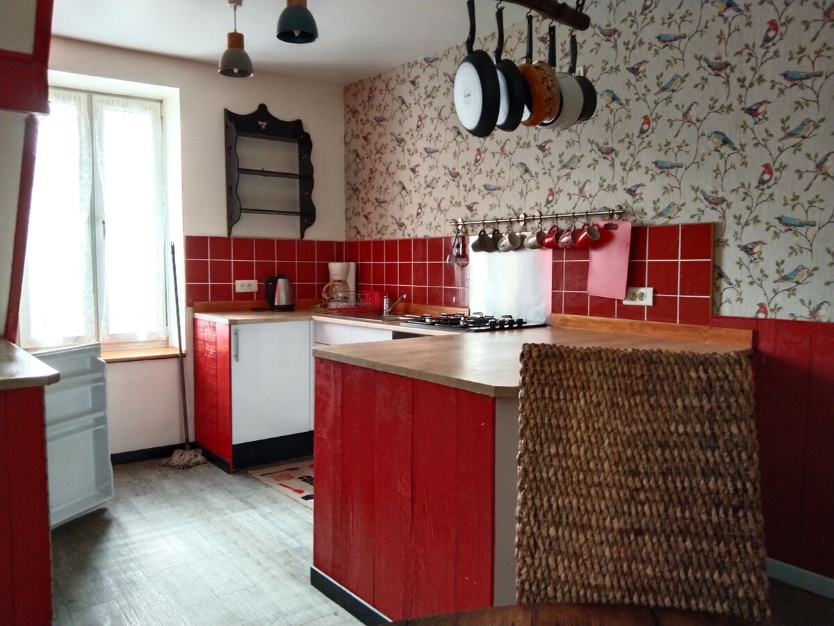 Esta casa de campo en el corazón de un pueblo, tiene una habitación principal con una zona de cocina (placas de inducción, horno mixto, nevera), un sofá, una mesa (plegable) con 4 sillas, un baño, y un gran dormitorio de arriba, una mesa que se puede utilizar para trabajar ( wifi de buena calidad), una cómoda, un armario. Posibilidad de comer fuera y utilizar la piscina.