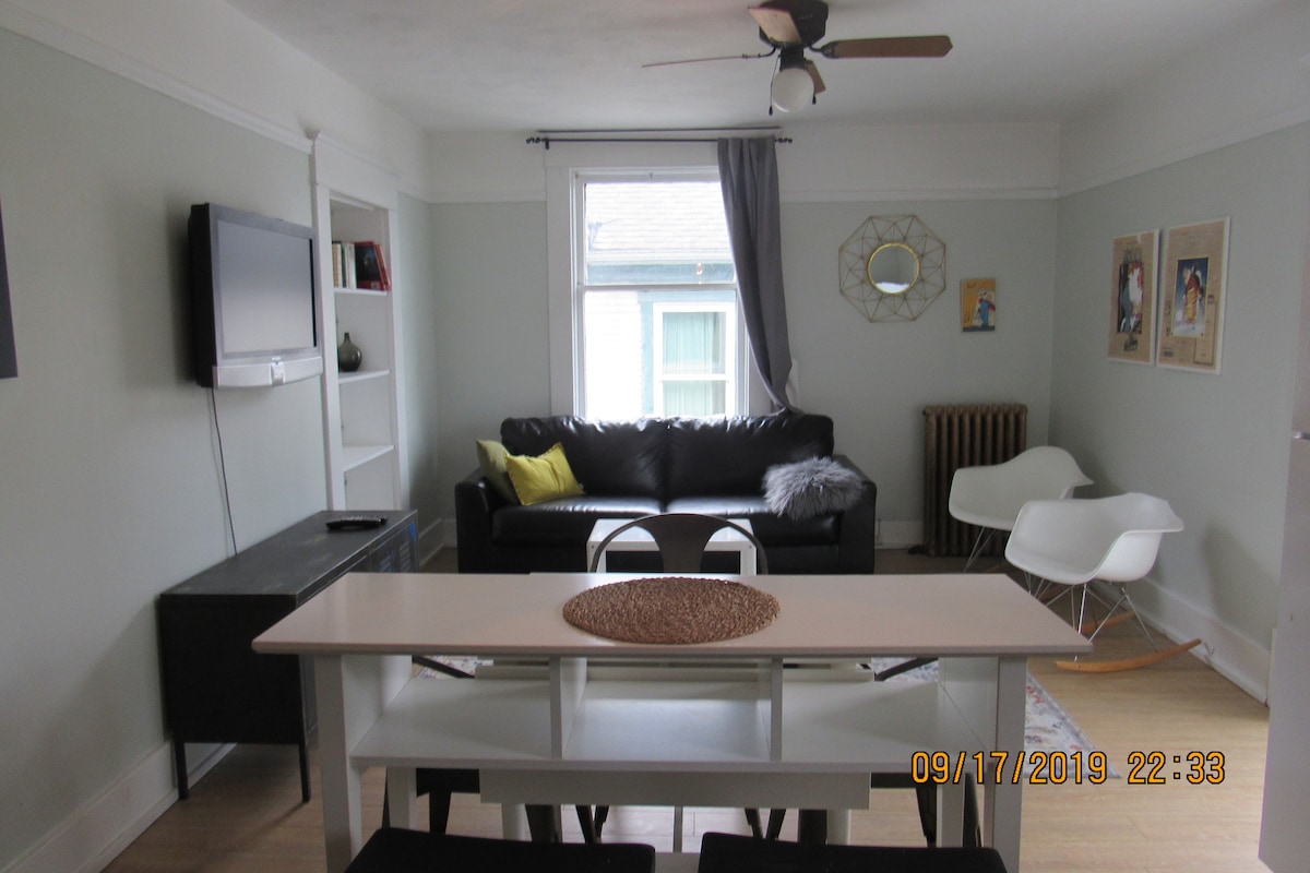 1 bedroom, 1 bathroom. Entire main floor space is in an excellent location between Main and Fraser. In a quiet neighbourhood, yet minutes walk from transit and a wide variety of trendy shops and restaurants. 15 minute drive from the airport. Private entrance, full kitchen and dining area, and a work space. Comfortable double futon, 32" TV with Apple TV, Netflix, and Crave. 9' ceilings. Family Friendly Port-a-crib and highchair available. Trampoline, sandbox in big backyard.