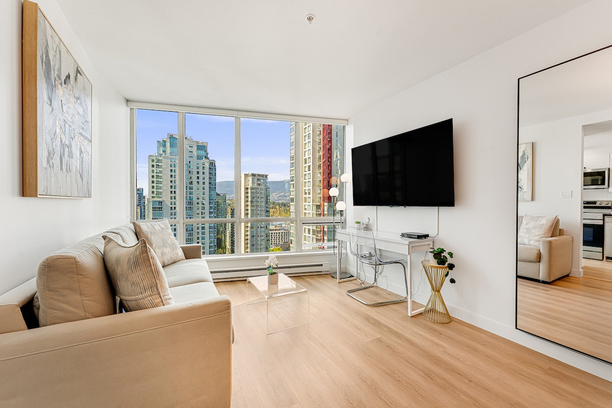 Amazing location, Canadian art, design and a great view. Treat yourself to a 5-star stay - perched high in the sky - right in the middle of downtown Vancouver. Walk everywhere, from mouth-watering restaurants, to shopping and even the seawall a short walk away. Super easy to get to from the airport - just a quick 10-minute walk from the skytrain. This is the perfect place to relax and unwind before exploring the town. This is a chill space though - please, no parties or events.