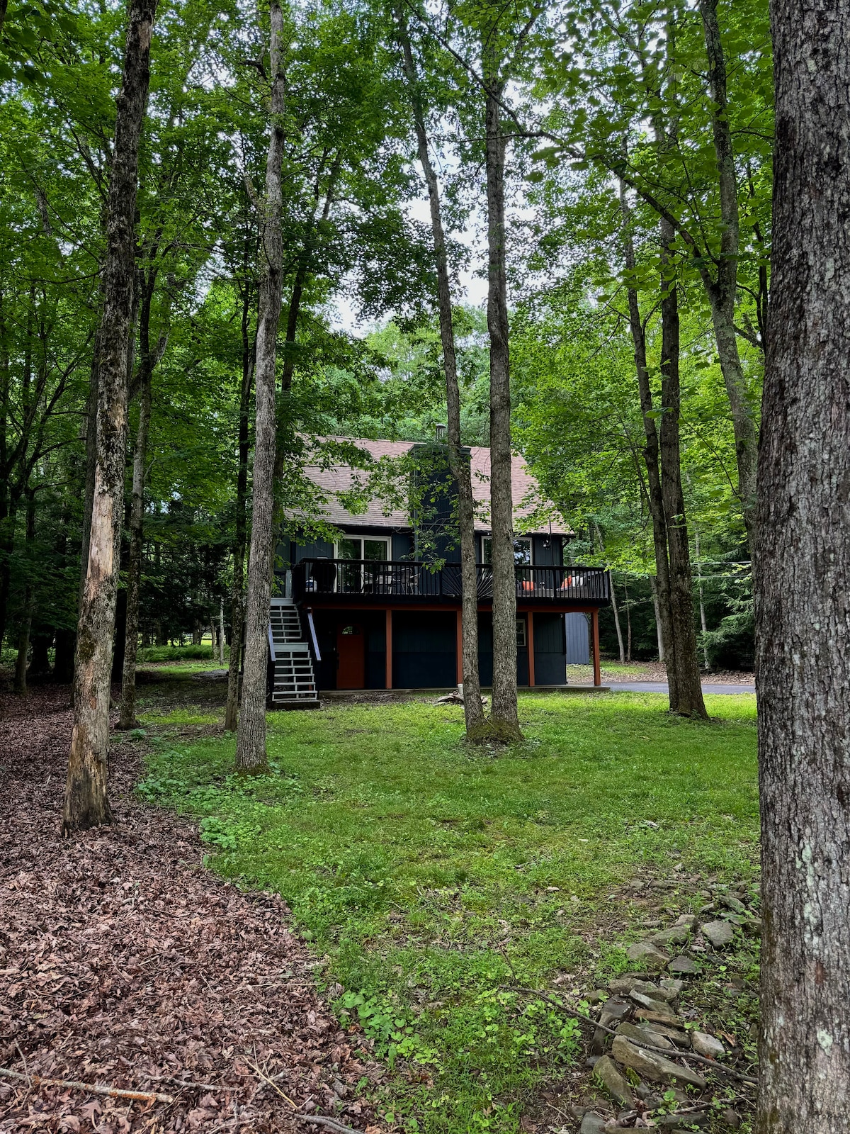 Newly renovated 4BR/3BA chalet on 10 private wooded acres in the Pocono Mountains. Sleeps up to 12 guests and is packed with amenities: a sauna, indoor fireplace, outdoor fire pit, two dedicated workstations with fast Wi-Fi, a yoga space, sunroom, and a fully stocked kitchen. Whether you’re seeking adventure or relaxation, you'll have quick access to the Pocono Mountains top attractions—whitewater rafting on the Lehigh River and skiing at Blue Mountain, Camelback, Jack Frost, or Bear Creek.
