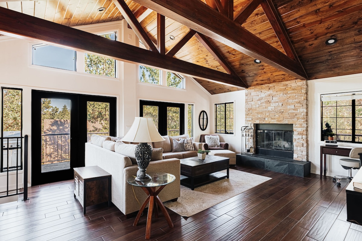 Nuevo - Carga de vehículos eléctricos durante la noche: 240 voltios NEMA 14-50 - ¡Trae tu adaptador! ¡VISTAS! ¡JACUZZI! ¡Cabaña de lujo Upper Moonridge cerca del esquí y el senderismo con tu propia colina segura en trineo en el patio trasero! Relájate en un impresionante entorno de montaña. Techos de madera y decoración rústica moderna. Gran máquina Arcade Pac-Man con 12 divertidos juegos. Disfruta de las vistas a la montaña o del yoga desde la terraza, observa a los niños deslizarse en el patio o acurrúcate frente a la chimenea de gas de piedra. ↓Haz clic en↓ Zoológico alpino Big Bear 3 Min 5 minutos de Bear Mountain 7 Min Snow Summit