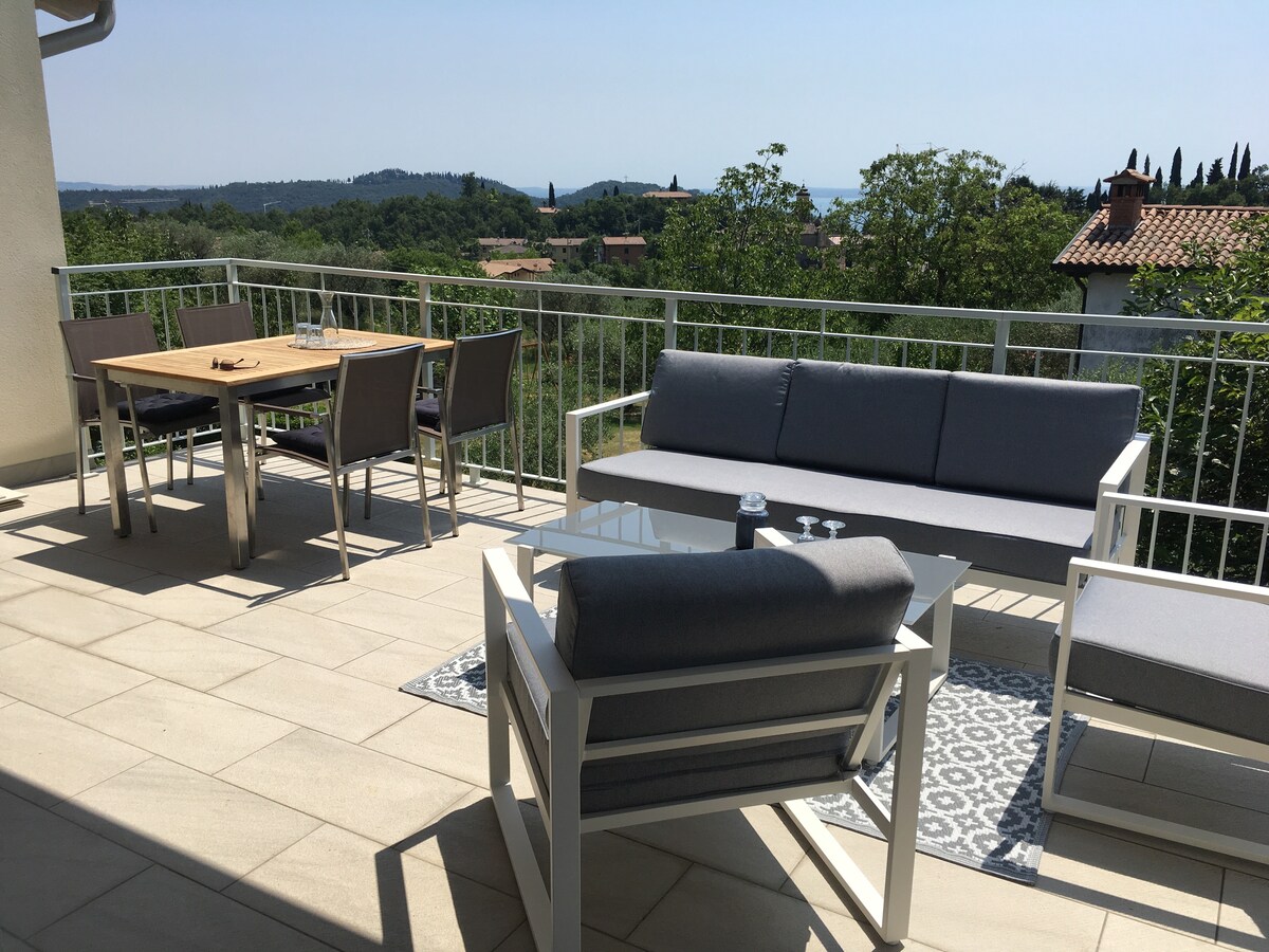 C.I.R. M0230360277 El apartamento está recién construido con un amplio estacionamiento sin vigilancia y se encuentra por encima de una tienda de tabaco y al lado una trattoria. A solo 10 minutos a pie del centro histórico y la orilla del lago; está en el primer piso con acceso independiente a través de escaleras en una ubicación tranquila. Desde la terraza de la sala de estar disfrutarás de las vistas del lago de Garda y las colinas adyacentes.
