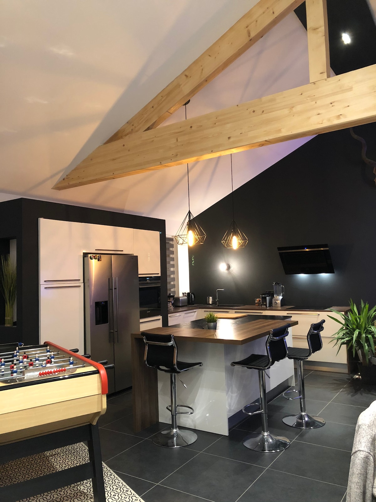 Maravillosa vivienda compuesta por : - dormitorio que incluye una cama tamaño queen de 150 x 200 + colchón cómodo de marca, un escritorio y un televisor de alta definición de 100 cm - Baño privado contiguo al dormitorio, equipado con una ducha, inodoro, lavabo y armario de almacenamiento. - Zona de desayuno equipada con cafetera, hervidor de agua, tostadora para desayunar - Gimnasio provisto de máquina de peso de musculación, alfombra y pesas de musculación - terraza exterior Te encantará la elegante decoración de este encantador alojamiento.