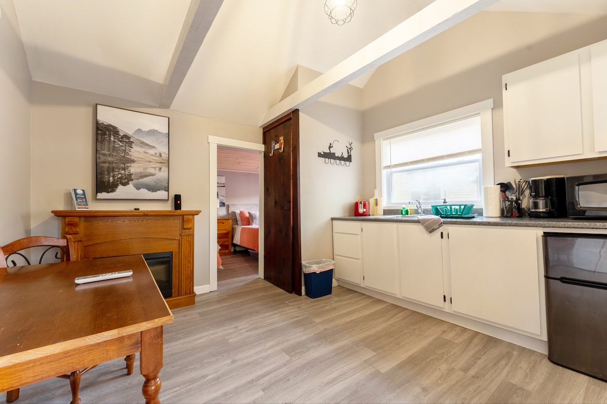 Cabaña recientemente renovada con vistas al lago • Cabaña bellamente renovada con capacidad para 2 personas. • Se admiten mascotas • Terraza con vistas al lago • Wi-Fi de cortesía • Televisión inteligente y altavoz bluetooth JBL • Acceso directo al lago (al otro lado de la calle) - Mininevera - Café, estacionamiento, kayaks y bicicletas de cortesía • A menos de 10 minutos a pie de restaurantes y atracciones locales.
