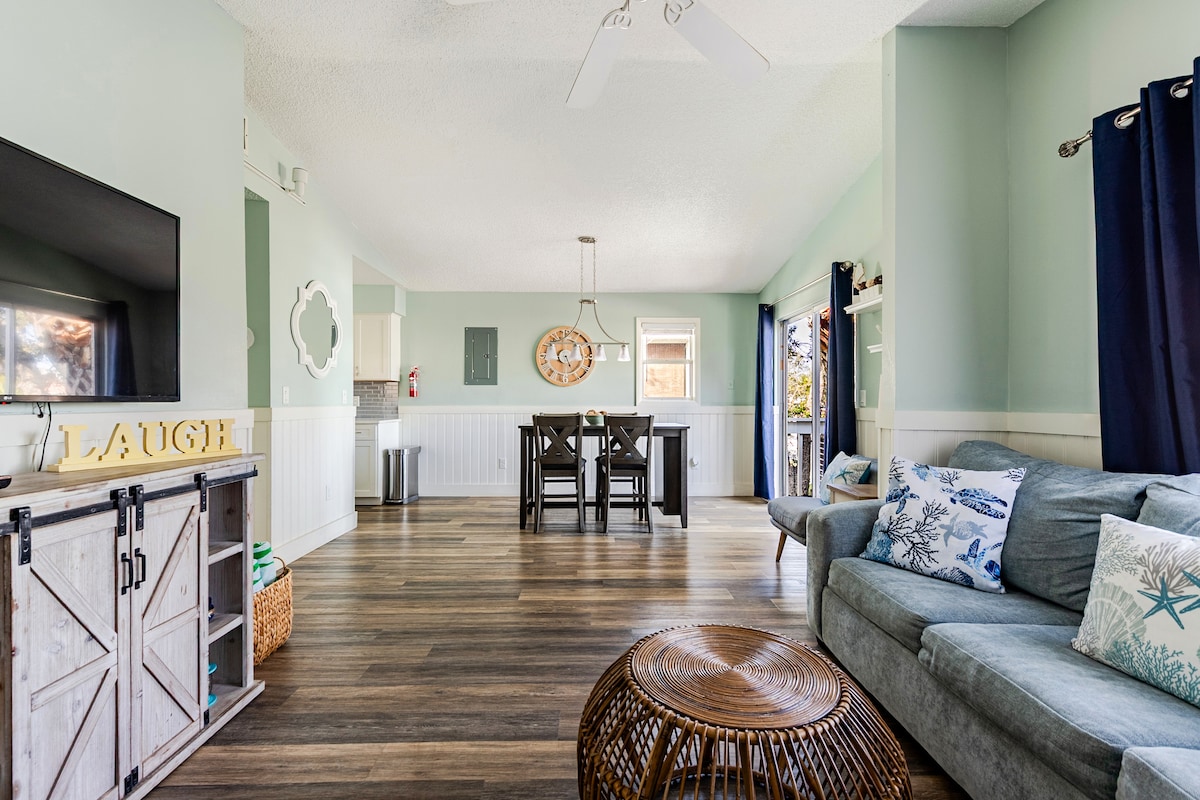 No te pierdas la increíble puesta de sol frente al mar desde la terraza. Esta casa de 1900 pies cuadrados recién renovada, 3 dormitorios y 2 baños, está a 10 minutos a pie de la playa o del aparcamiento de la playa. Capacidad para 10 personas, 1 cama tamaño king, 2 camas tamaño queen, 2 camas queen extraíbles, 6 plazas de aparcamiento, terraza grande, muelle disponible para los huéspedes, muebles de patio, parrilla de gas y mucho más. Cerca de tiendas, restaurantes y entretenimiento. Vuela a través del aeropuerto internacional de Tampa y el aeropuerto de San Petersburgo. Impuesto comercial BT n.º 1701