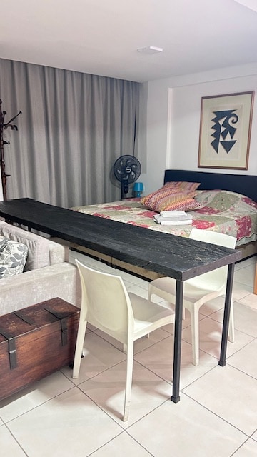 Aqui, tudo é fácil e prático, do início ao fim da sua estadia! O imóvel foi muito bem montado e pensado para proporcionar a melhor experiência possível. Um quarto amplo e com varanda, que possui uma cama de casal, fornecendo uma sensação de amplitude. É um bom lugar para renovar a energia. Roupas de cama, 2 travesseiros, toalhas e uma coberta de casal estão inclusas na reserva. Tudo o que voce precisa para uma boa estadia
