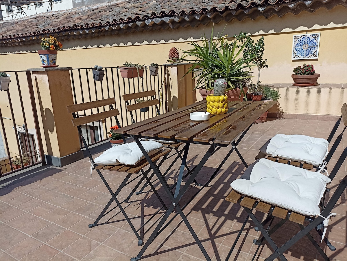 Appartamento di 120 mq con terrazzo: luminoso, silenzioso, elegantemente arredato in stile siciliano. Una vera casa ricca di personalità, con mobili antichi, ferro battuto, pietra lavica e terrecotte lavorate da sapienti artigiani che raccontano tutta la bellezza e la forza di questa terra. Le grandi finestre permettono sempre di vedere il mare quando si è in casa. Il delizioso terrazzo vi consentirà di godere di ogni momento: pranzare, leggere un libro e bere un buon bicchiere di vino.
