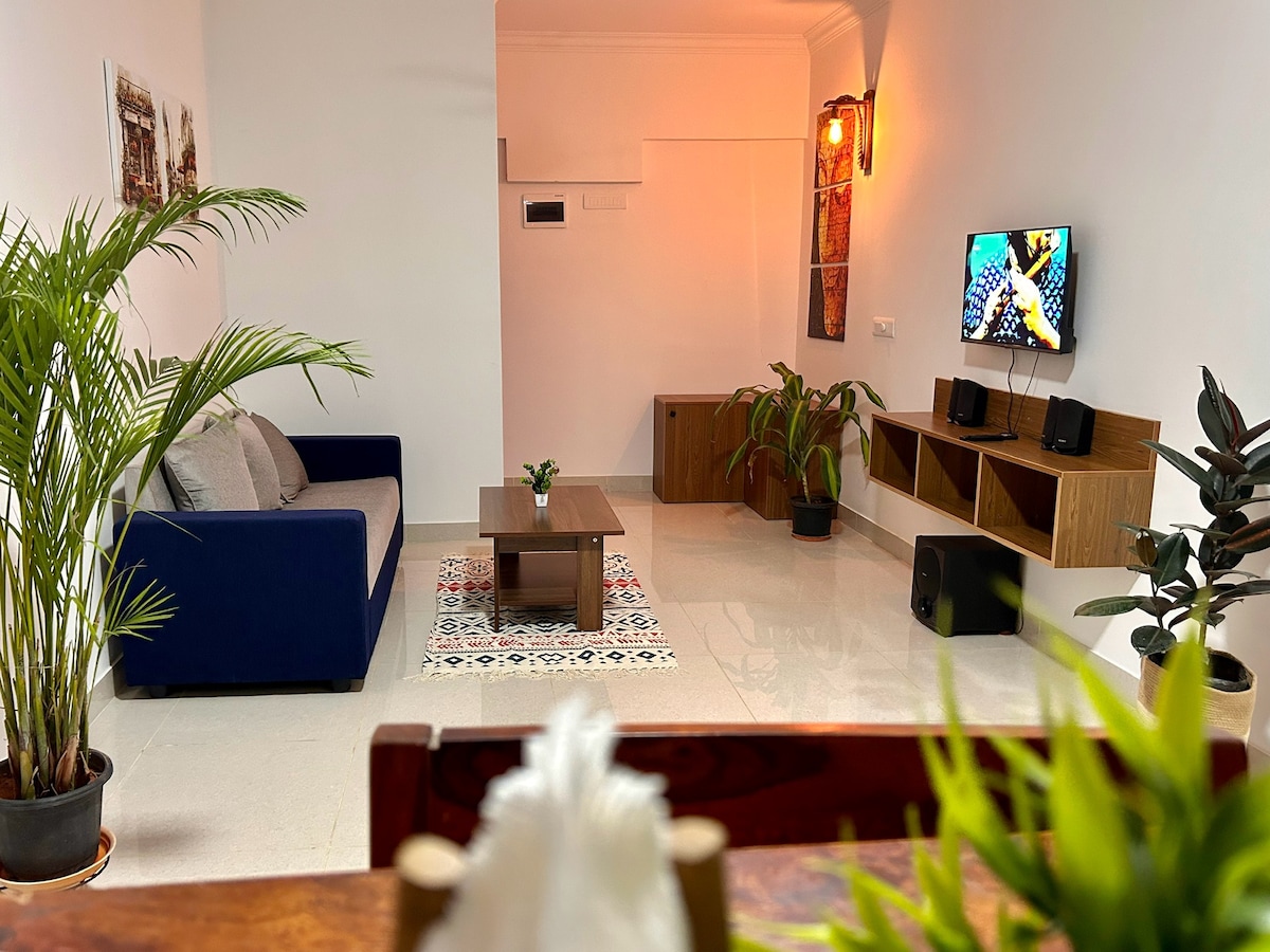 Nos encantaría hospedarte en nuestro 1 BHK (EARTHY Homestay) que combina estilo con un ambiente terroso y tranquilo y panoramas inmejorables. - Balcón Oasis: vistas al bosque + puestas de sol cinematográficas a 200 m - Prime Locale: 2 minutos a NIFT y 3 minutos a las cafeterías, boutiques y comida callejera de 27th Main - Interiores serenos: cama tamaño queen, iluminación ambiental y exuberantes plantas vivas - Trabajo y ocio: wifi de alta velocidad, TV grande y aire fresco Disfruta de estilo, serenidad y puestas de sol espectaculares, ¡todo en un acogedor refugio! - 5ª planta (sin ascensor)