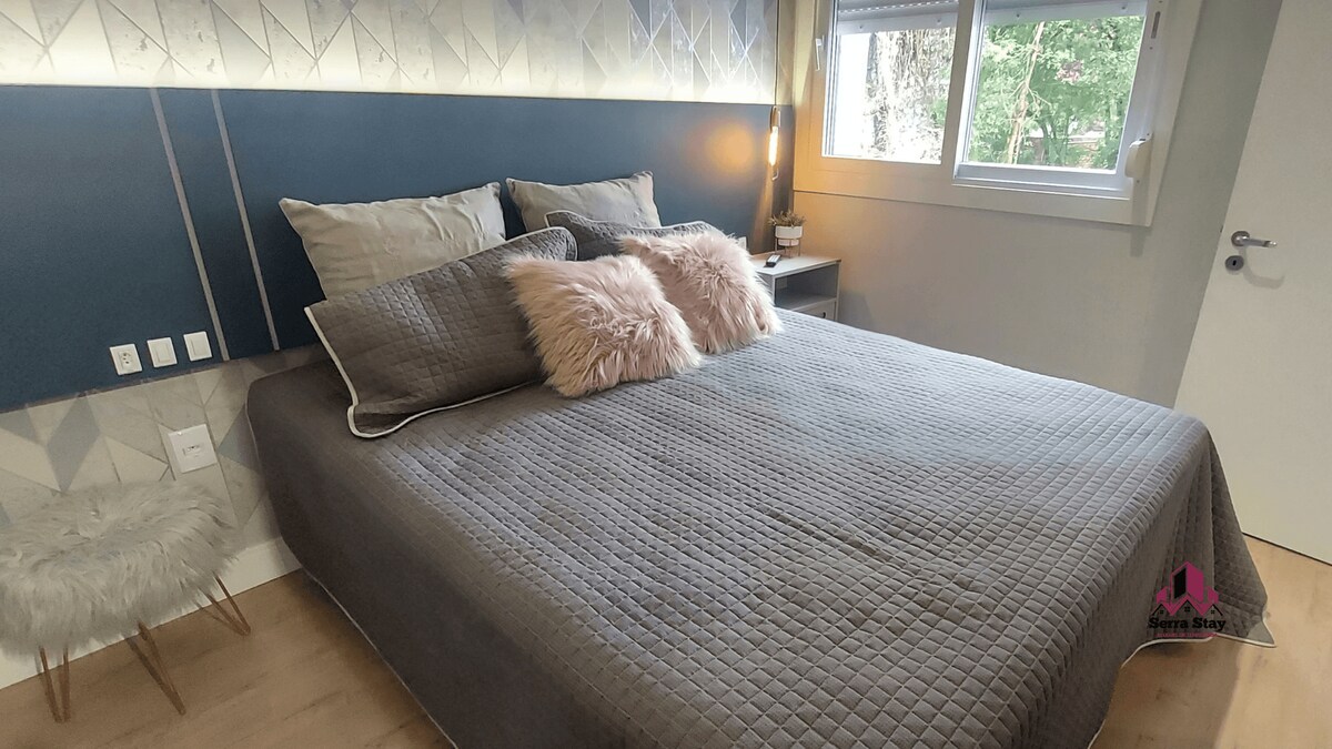 Este espaço está em uma localização privilegiada, próximo aos principais pontos turísticos da cidade, a apenas 200 metros da fonte do vinho e dos shoppings, e a 5 a 10 minutos do vale dos vinhedos. Facilita o planejamento da sua estadia na capital do vinho. O apartamento oferece ar-condicionado, cafeteira, churrasqueira, TV na sala e no quarto, geladeira, fogão, louças, chuveiro, secador de cabelo, ferro de passar e outras comodidades.