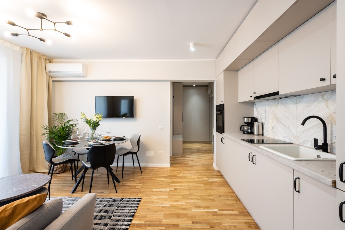 Apartamento artístico de 1 dormitorio totalmente renovado, ubicado en corazón de Bucarest. El lugar cuenta con las instalaciones a las que uno está acostumbrado en los apartahoteles premium, con una impresionante vista al río. Disfruta de una fabulosa vista del Palacio del Parlamento (segundo edificio administrativo más grande del mundo, después del Pentágono) directamente desde el balcón. Tu dulce escapada está situada a 3 minutos a pie de la estación de metro «Timpuri Noi» y a 10 minutos a pie de «Piata Unirii».