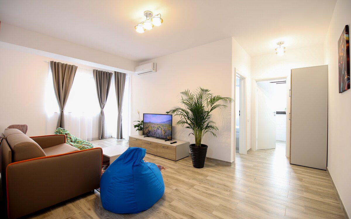 Moderno y acogedor apartamento de 1 dormitorio cerca de Plaza Mall, Afi Mall y cerca del centro de Bucarest. Espacios luminosos, un sofá, una televisión inteligente y una cocina totalmente equipada con Nespresso. Disfruta de los artículos de tocador Rituals, un balcón relajante y aparcamiento gratuito. Perfecto para un máximo de 3 huéspedes que buscan comodidad, estilo y fácil acceso al metro, parques, restaurantes, cafeterías y vida urbana.