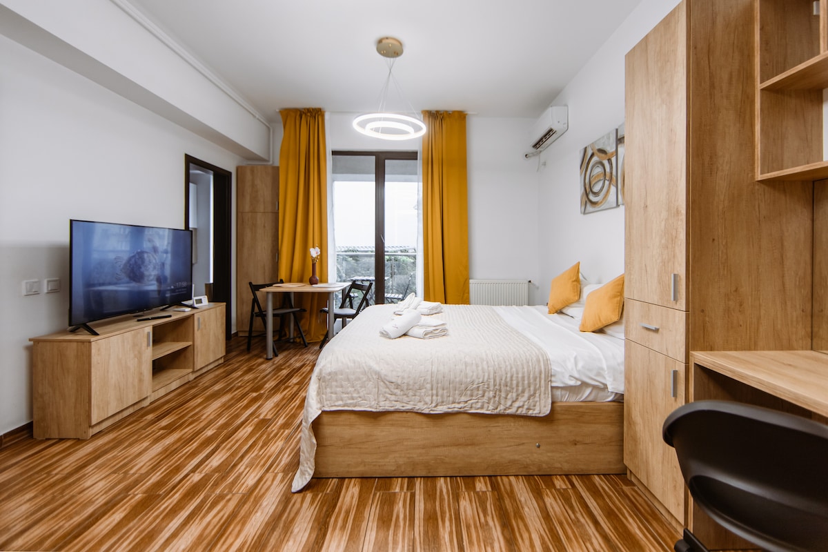 We are inviting you to escape the city buzz and unwind in this modern, fully-equipped Studio apartment nestled in the western suburbs of Bucharest. Perfect for couples, small families, group of 4 or business guests, this cozy place offers all the comfort you need for a relaxed stay. Located in a residential area with easy access to public transport, shops, cafes and urban accessibility. Please message us if you have any questions or you are not fully decided to stay with us.