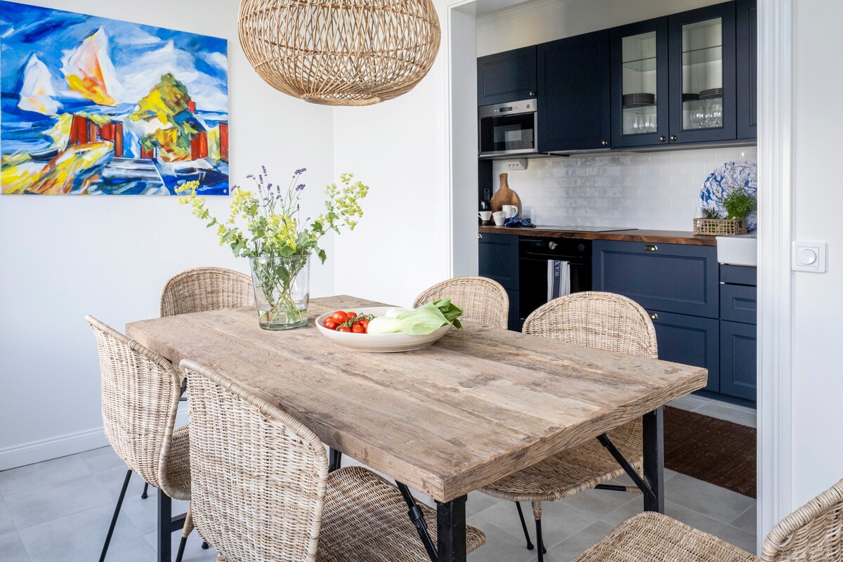 Charming 130-year-old cottage (90 m²) with a modern yet cosy feel. Two renowned spas (Yasuragi & Skepparholmen) within walking distance. Bottom floor: kitchen and dining area with classic wood stove, living room and bathroom. Your own garden and spacious wooden deck—perfect for sunbathing or BBQs. Set in a beautiful area with a crystal-clear lake for bathing just 200 m away, with a nature reserve surrounding it. Sea dock ~700 m. 30 minutes to Stockholm by Waxholm boat, bus or car.