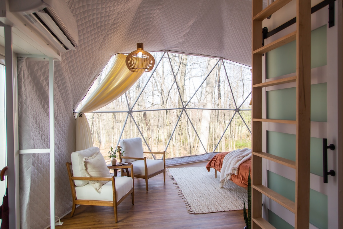 Quédate en este alojamiento único y disfruta de los sonidos de la naturaleza. Despiértate por la mañana y observa cómo los ciervos se alimentan fuera de tu ventana panorámica. Por las noches puedes sentarte fuera en el jacuzzi y escuchar a las ranas toro. Es una experiencia glamping muy especial con todos los servicios que necesitas para relajarte y desconectar.