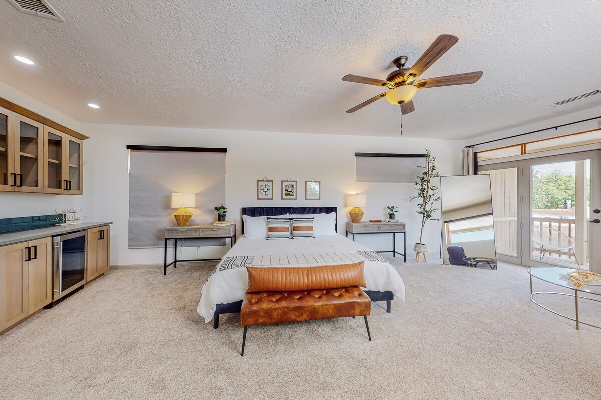 Disfruta de lo mejor de Albuquerque en nuestro hogar. Un hermoso y aislado lote boscoso y espectaculares vistas a la terraza. Amplia suite principal con cama tamaño king, baño de spa con bañera de inmersión y ducha a ras del suelo, vistas a la montaña al amanecer y al atardecer. Sala de estar de concepto abierto con TV TCL HDR QLED de 75 pulgadas para ver tu película o evento deportivo favorito. Dos dormitorios llenos de luz con camas tamaño queen y moderno baño compartido. Cocina gourmet, espacios de trabajo virtuales con monitores y espacio de yoga y ejercicio. Camine hasta el gran parque justo al