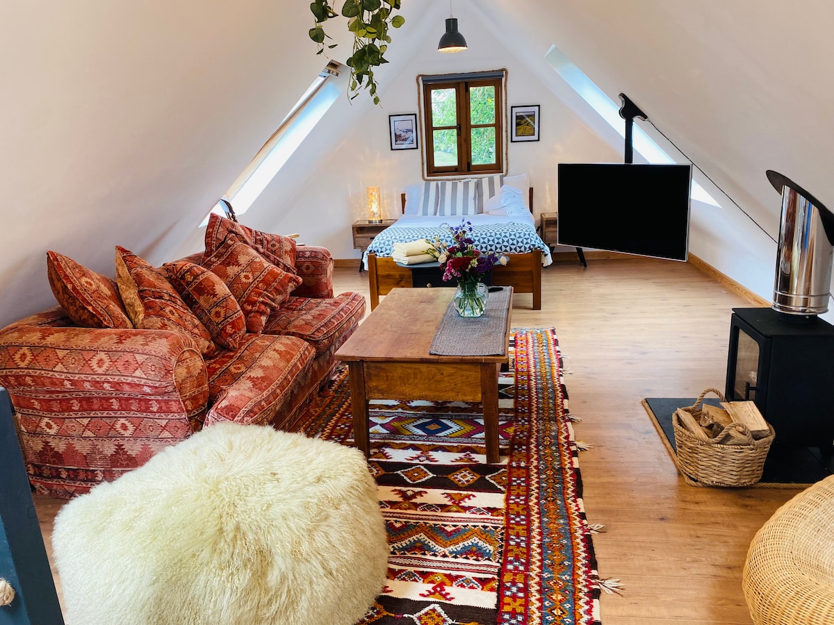Este estudio de un dormitorio es excepcionalmente cómodo y tiene un ambiente tranquilo y elegante. Está separado de la casa principal para que tengas total privacidad y todo el espacio sea tuyo para disfrutar. La calefacción por suelo radiante lo hace gloriosamente cálido y acogedor, las sábanas de lino son de la mejor calidad y se encuentra en un hermoso valle que tiene una cantidad inusual de pájaros cantores y búhos. Ha sido diseñado pensando en la paz y la comodidad. Una escapada ideal. La carga súper rápida de vehículos eléctricos está a 12 minutos.