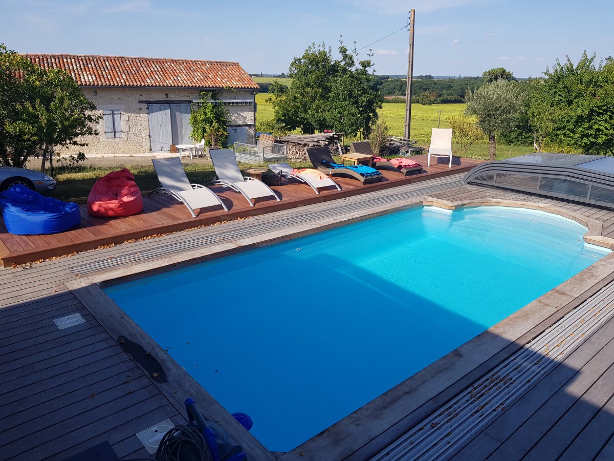 Two 5 star countryside gites in Charente, Southwest France, bookable separately or together. Pool open 1st May. Great rental packages for up to 10/12 guests. 130m2 internal space, free off-road parking, a super 6x4m, safety fenced swimming pool, fantastic countryside views. Bordeaux 55 min, Atlantic coast, 75 min, Angouleme 25 min, local town of Barbezieux with market, supermarkets, swimming pool, cinema, EV charging - 10 min. Cognac and Jonzac, Thermal Spa & swimming pool complex 35 min.