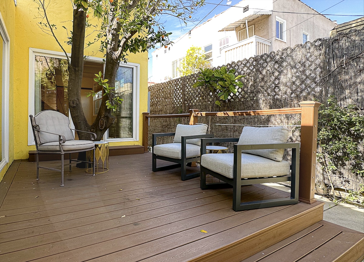 ¡Ubicación céntrica, segura y atractiva en West Hollywood! Acceso privado a la elegante y tranquila suite con luz solar, tranquila pero cerca de todo. Este chalet de invitados de 1920 te hará sentir como en casa desde el momento en que entres. Las puertas francesas rodean la sala de estar, la cocina pequeña y el comedor, conectan con una terraza privada al aire libre, dormitorio y baño. Situado en el corazón de WeHo (a 1 manzana de la calle principal). Todo lo que necesitas para tomar el sol, socializar o recargar energías antes de emprender aventuras en Los Ángeles.