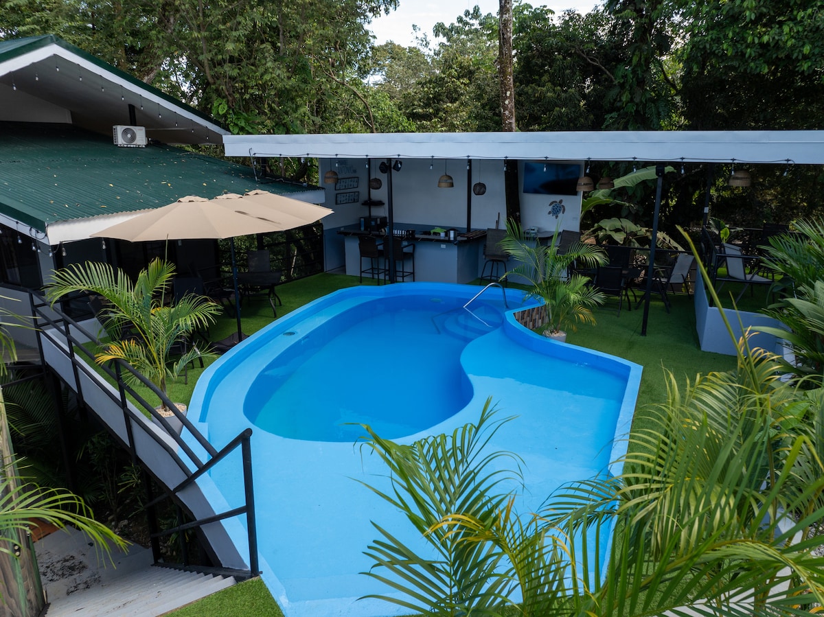 Estamos ubicados en el Corazón de Manuel Antonio, contamos con una ubicacion privilegiada con acceso a playa y rodeado de exuberante naturaleza. Las instalaciones ofrecen amplio parqueo, un tiki bar, y sillas de playa incluidas para nuestros invitados. La habitacion se ubica en primera planta es de facil accesso y cuenta con un area social justo al frente, ideal para compartir en familia.