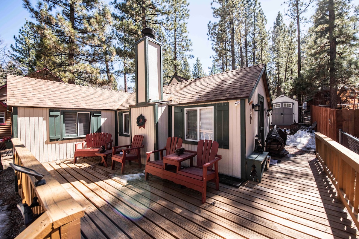 Escape to our recently renovated 1936 Cozy Cabin. Walking distance to Bear Mountain, Alpine Zoo, Bristlecone hiking trail, 1.1 miles to Snow Summit, 2.9 miles to the Village for great shopping and more! After your great adventures, enjoy our outdoor fire pit and soak in the hot tub under the stars. Our Cabin sits on a large 5K sq ft fenced lot. Cabin includes: central heat, AC, 5G Wifi, smart TV, Super Nintendo, DVD Player, new appliances, propane BBQ, new mattress for a great night's sleep.