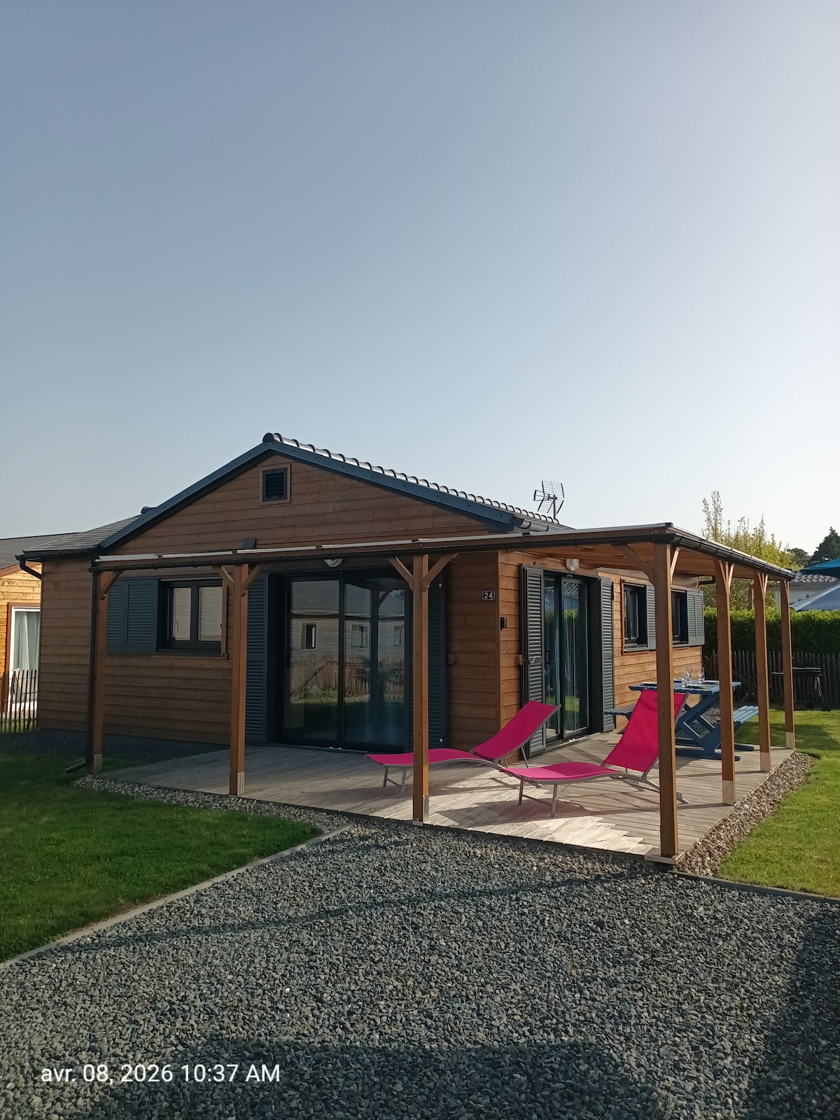 Chalet en un parque residencial de ocio tranquilo. A 2 km del mar, del centro del pueblo (puerto, tiendas y supermercado). Cabaña de 25 m² con terraza, dos dormitorios (uno con cama de 140 y otro con dos literas), cuarto de baño con ducha e inodoro, cocina equipada (nevera, horno, microondas, lavavajillas, cocina de gas, cafetera, utensilios de cocina, barbacoa), televisión. Se proporcionan almohadas, edredones y sábanas. La piscina exterior climatizada está abierta durante el verano (de junio a septiembre)