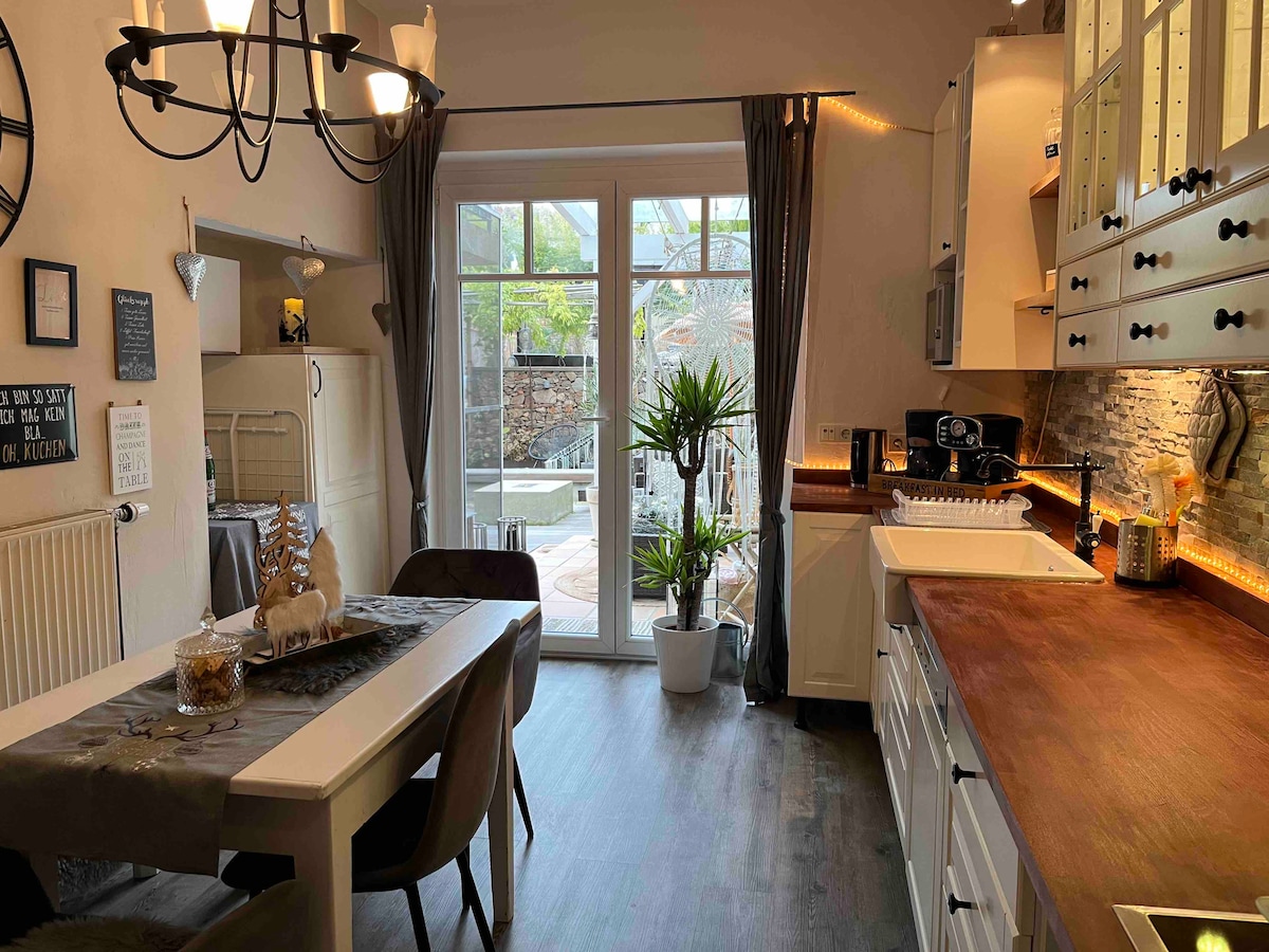En un apartamento de un edificio antiguo bellamente renovado, techos altos, tablas de madera auténtica, zona residencial tranquila pero céntrica, es fácil relajarse después de un buen día de vacaciones. El apartamento tiene dos dormitorios, sala de estar, cocina y baño, aseo de invitados. Una terraza en el jardín está reservada para los huéspedes. Las camas se hacen según tus deseos, se proporcionan toallas.