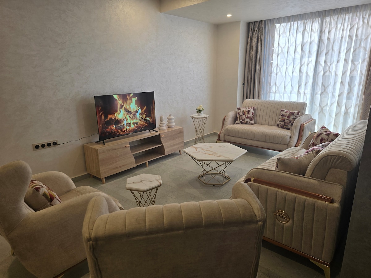 Location d'un bel appartement F4 2ème étage à Akid Lotfi Oran meublé et très bien équipé ( climatisation, chaudière, électroménager, vaisselle, eau h24...) dans un endroit calme et sécurisé près de toutes les commodités (boutiques, restaurants, cafétéria, jardin...) à 05 minutes à pied du boulevard animé d'el Akid et du jardin de méridien. la location concerne uniquement les familles (livret de famille obligatoire) et les missionnaires.