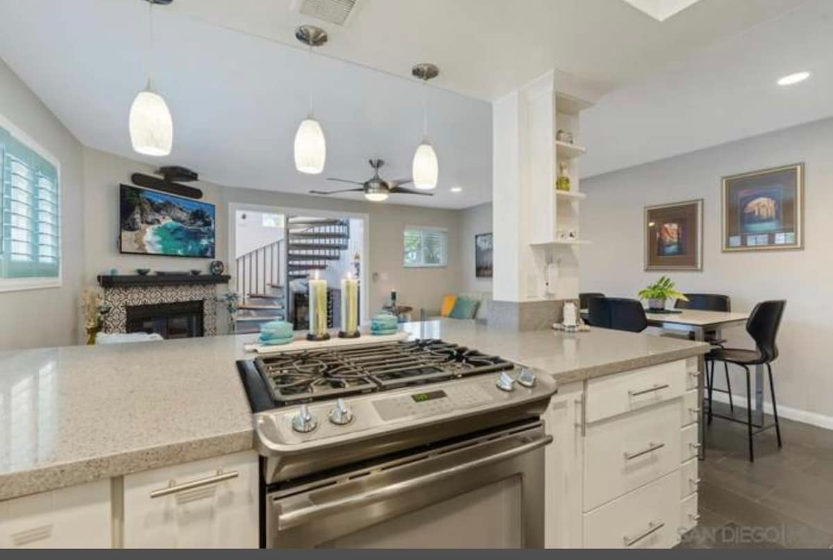 Come stay in the happiest place in California! Take daily walks or bike rides to our fabulous beaches & enjoy the fresh ocean breezes. This quiet neighborhood is located in N. Pacific Beach only 2 blocks to Tourmaline Surf Park Beach & walking distance to the famous PB pier. We provide classic rusty cruiser bikes & beach gear. The cozy shared patio is equipped w/ gas BBQ grill & fire pit. You’ll also have fast Wi-Fi to work remotely. **Home is suitable for 2 adults & 2 kids but NOT 4 adults**