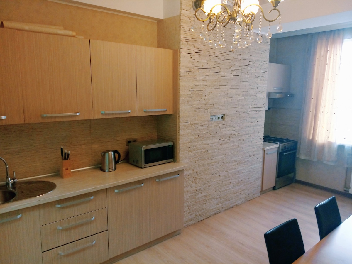 Amplio departamento de 100 metros con vistas panorámicas en el centro de la ciudad. Ideal para nómadas digitales. El departamento cuenta con todo lo que necesitas. Cama grande y cómoda, dos lugares de trabajo, WIFI de alta velocidad y cocina, equipada con todas las necesidades, incluida la lavadora de platos. Está cerca del Parque Panfilov (parque de atracciones), Oak Park, el estadio de fútbol, la plaza de la ciudad y la Casa Blanca. También hay muchas tiendas de comestibles, cafeterías, restaurantes cerca.