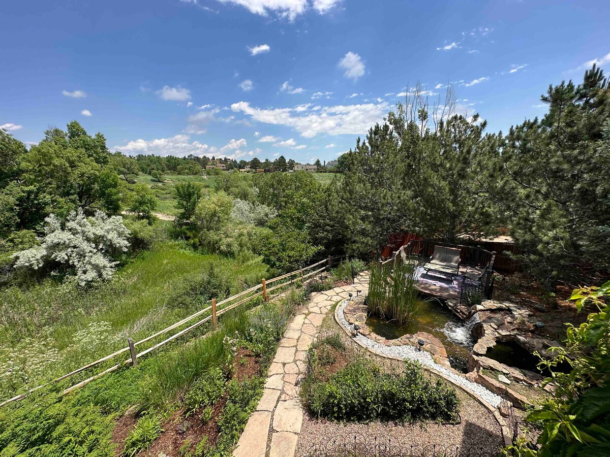 Acomódate en la suite privada Stone Falcon de 528 pies cuadrados que incluye cocina pequeña, sala de estar, dormitorio, baño y sala de estar exterior con vista a Pikes Peak, todo a pocos minutos de la Academia de la Fuerza Aérea, el Jardín de los Dioses y el Bosque Negro. ¡Disfruta de todos los servicios de la ciudad en un terreno de un acre y ni siquiera sabrás que estás en medio de una bulliciosa ciudad! Permiso n.º A-STRP-25-0058