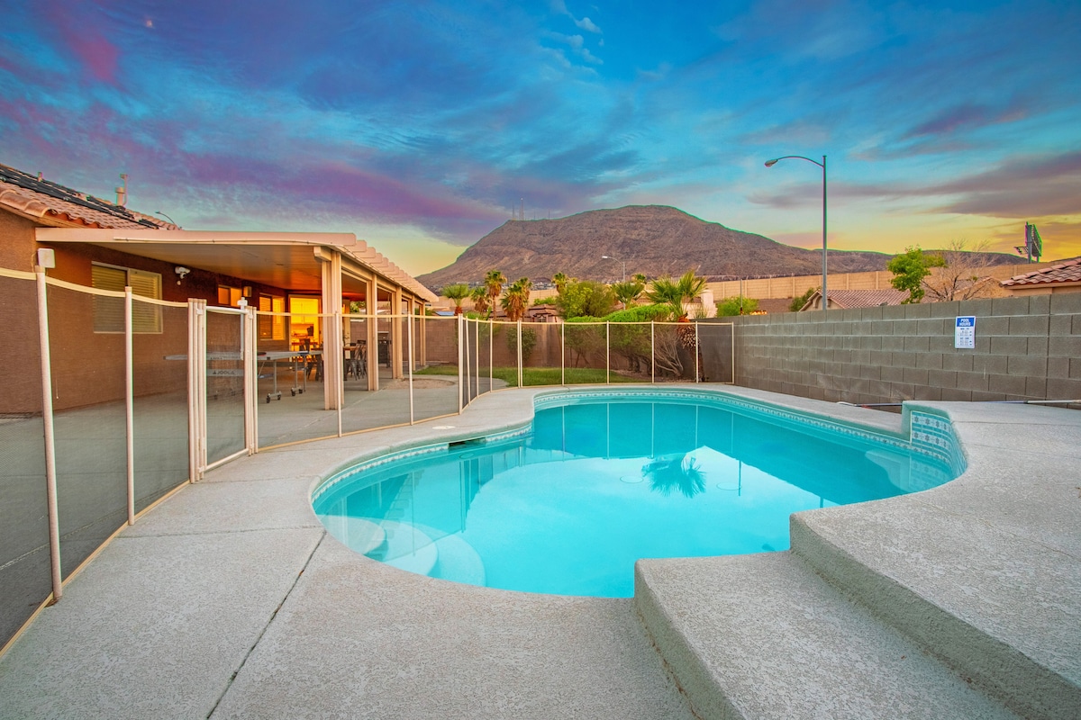 4 dormitorios (1 tamaño king/3 tamaño queen), 2,5 baños/2200 pies cuadrados, casa con piscina/spa y putting green (calefacción de piscina adicional). Sala de juegos, cocina bien surtida, sala de estar con TV inteligente de 60 pulgadas, hermosa piscina climatizada y spa relajante. La cascada y el putting green te ayudarán a disfrutar de la hermosa Henderson en la zona de Mission Hills. A 20 minutos en coche del Strip de Las Vegas o Boulder City. El espacio al aire libre incluye tumbonas en la cubierta de la piscina recientemente renovada, mesa al aire libre con asientos/zona de estar en el patio cubierto. Para obtener más información, consulta los detalles.