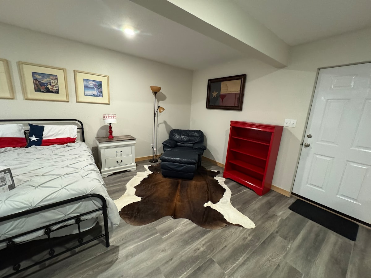 Desconecta de la rutina en este alojamiento único. Privado y acogedor. Ubicado a pocos minutos del lago Texoma y del casino Choctaw. Disfruta de las compras en las tiendas de moda y de los restaurantes del centro de Denison Tx. Hay muchos restaurantes increíbles disponibles a pocos minutos o puedes preparar tus propias comidas en esta acogedora cocina bien equipada. El gran vallado del patio es un trabajo en curso con planes para un pozo de fuego, una hamaca, una mesa de picnic con sombrilla y un poste de observación de aves. ¡Ven a ser nuestro huésped!
