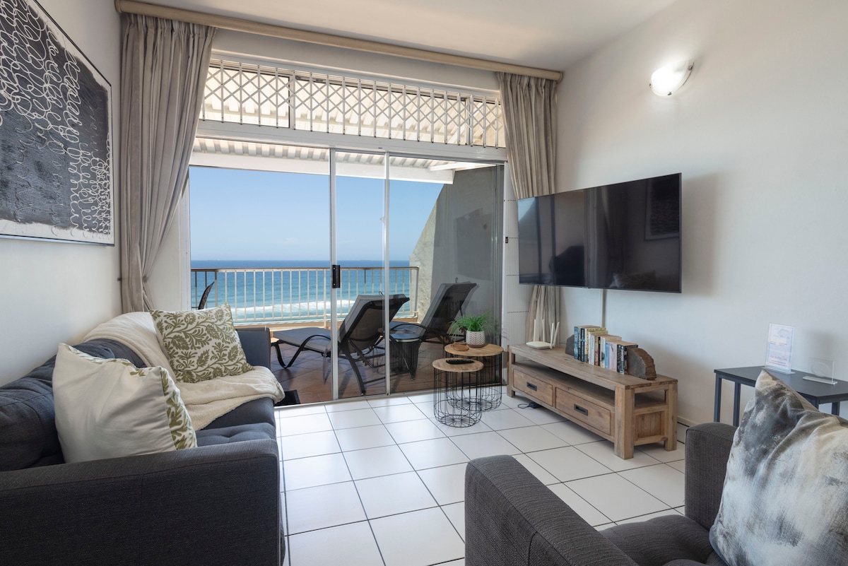 Home away from home comfort in a well furnished and equipped 3 bedroom fully self-catering apartment overlooking life-guarded Bronze Beach. Gorgeous ocean views, A spacious balcony with breath taking views, full DSTV, Netflix, uncapped wifi, aircon in the open plan living area and ceiling fans in all rooms. Pool towels, bathroom and kitchen amenities are provided. Easy beach access gate and a beautiful big pool in the complex. Secure parking on-site and an undercover parking. 24 hour security.