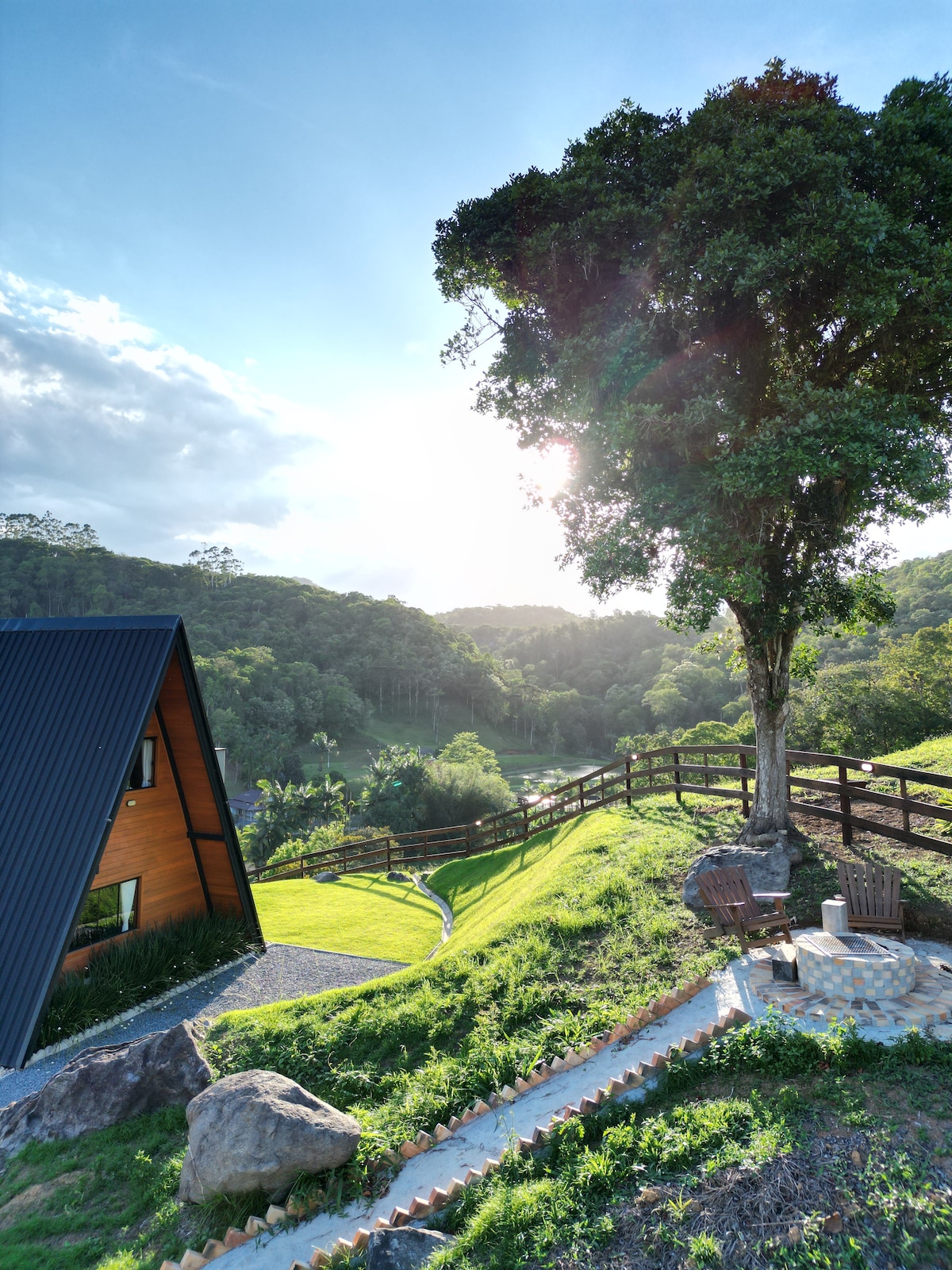 Aquí, rodeados por el Bosque Atlántico y con una hermosa vista de Pomerode, la naturaleza fue tan generosa que creamos una cabaña con paredes y techo de cristal, para que puedas apreciar todos los detalles de este increíble paisaje. Imagina dormir bajo las estrellas y despertarte con el amanecer en medio de los árboles, todo en la comodidad de un chalet con una bañera climatizada, una cama deliciosa, una cocina equipada y una zona exterior con una chimenea. Más información en @capannachales