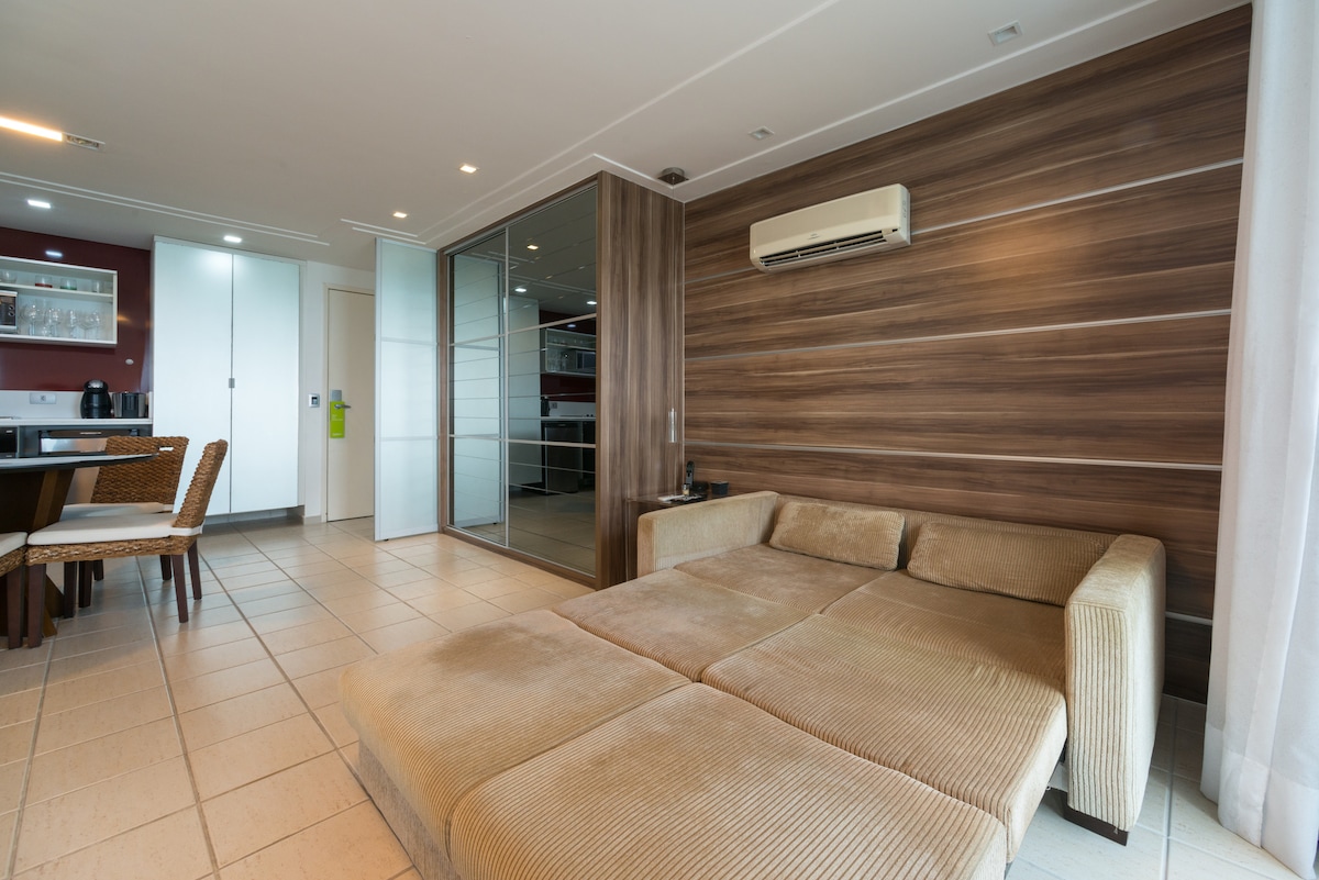 ⭐️⭐️⭐️⭐️⭐️Quarto e sala, esta em uma excelente localização de Boa Viagem, com cama de casal e um sofá cama, cooktop e microondas, 2 ar-cond (Split), 2 Smart Tv, wifi, armário, espelho, mesa de trabalho, mesa de jantar, utensílios e eletrônicos de cozinha, peças de cama e banho. Vaga de garagem, moveis planejados, salão fitness. Próximo ao Shopping Recife (5 min a pé), a praia (10 min a pé) e em frente ao Mix Matheus (Supermercado com utilitários). Academia, piscina, sauna e restaurante. Seguro