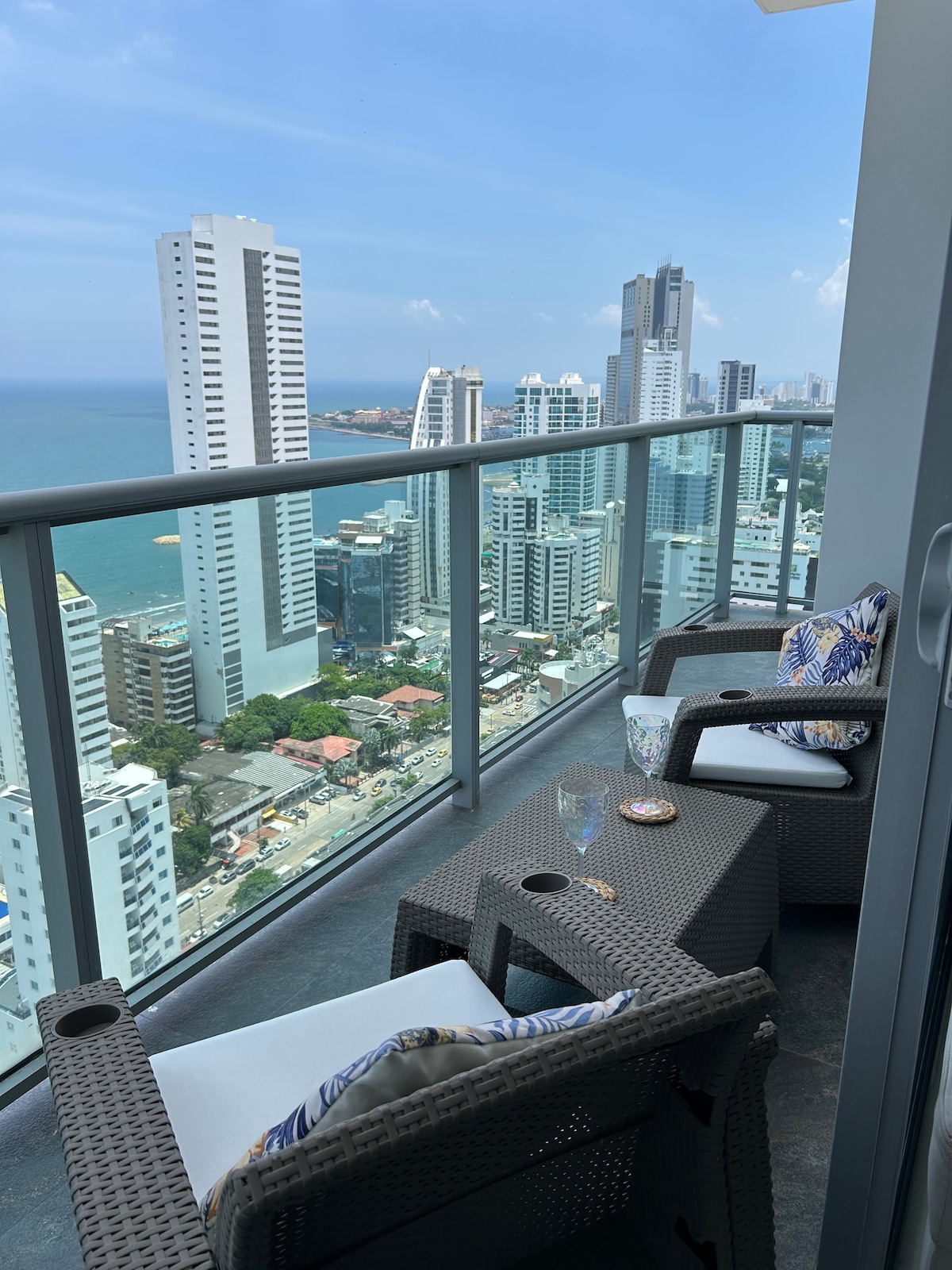 Exclusivo apartamento piso 30 Morros City con vista increíble y cautivadora al mar y centro histórico. Habitación principal con vista directa al mar y acceso al balcón. Cocina completa, lavadora y secadora 2 en 1, Smart TV 60", WiFi 500MB fibra óptica. Frente a la playa en Bocagrande con amenities de lujo: piscina, jacuzzi, turco y gimnasio. Parqueadero gratis. Ideal para parejas que buscan la experiencia más exclusiva desde el piso más alto disponible en toda Cartagena.