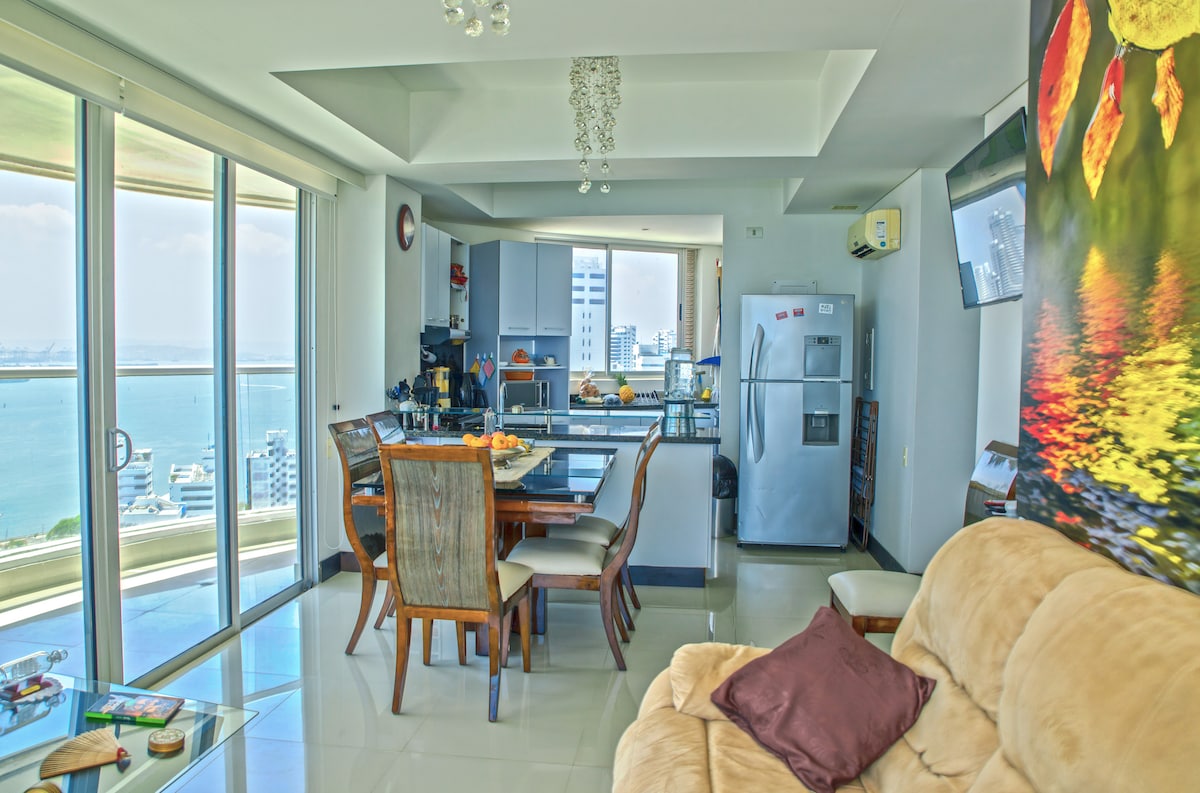 Nuestro elegante apartamento está ubicado en uno de los más completos y modernos edificios del exclusivo sector "Cielo Mar", a pocos metros de una de las mejores playas de la ciudad "Playa azul", a 10 minutos del Centro Histórico y a 5 minutos del aeropuerto. El apartamento tiene una vista Extraordinaria de la Bahía y el Océano que puedes disfrutar desde el Jacuzzi privado en el balcón o en las increíbles Piscinas infinitas en el Rooftop que cuenta Jacuzzis, Sauna, Terraza Bar & BBQ