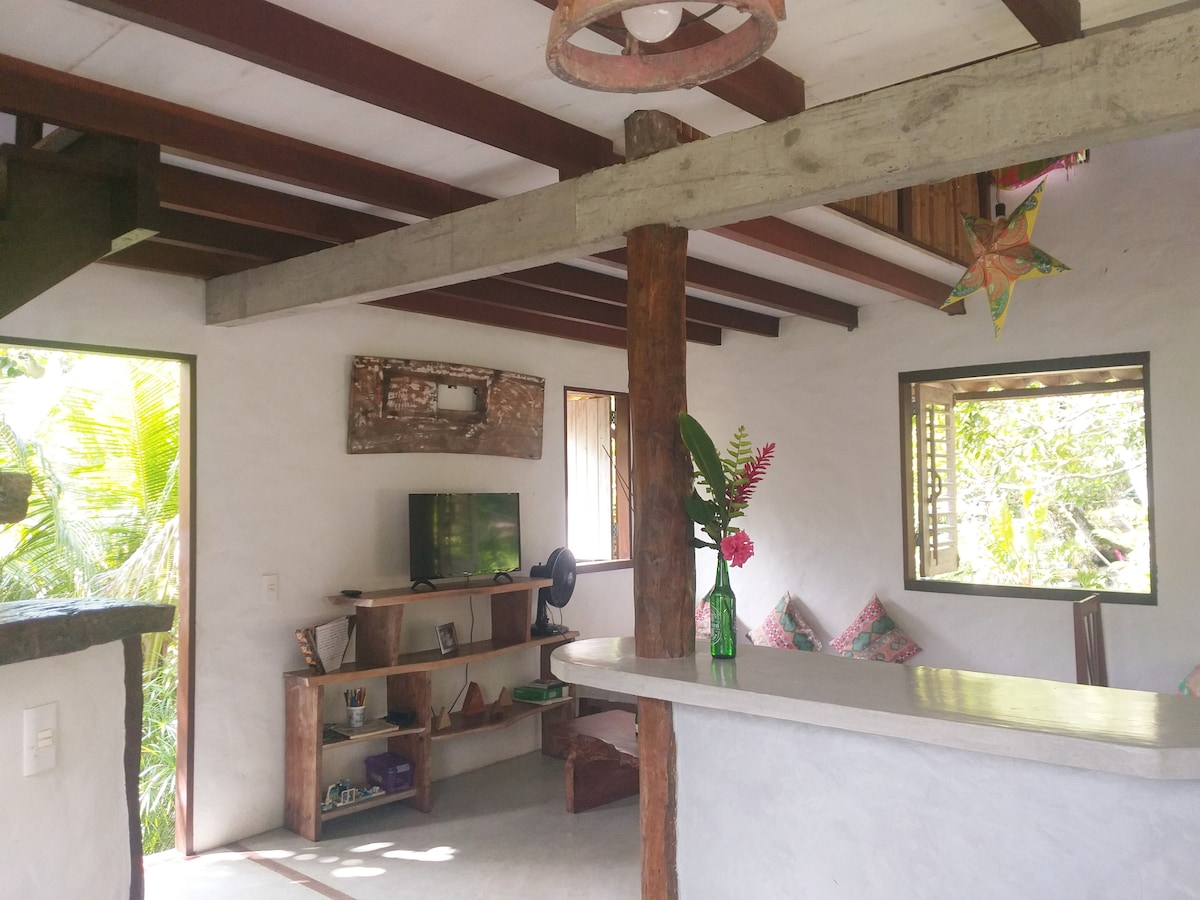Refugio en el bosque de la isla de Boipeba. A 800m-Piscinas Naturales de Moreré, 200m-Vila Quilombola Monte Alegre y 3km-Vila de Boipeba. Con la casa hecha de barro somos parte de la Naturaleza. El propósito aquí es ser armonioso y mezclarse con el espacio. Por eso la casa fue hecha con material más sostenible: madera, botellas, vidrios y ventanas de ómnibus y coche. Inodoro seco por cámara compostable, y agua que nace allí y vuelve a través del círculo de plátanos. Estar ahí para mí es sentirme uno con la Madre Tierra.
