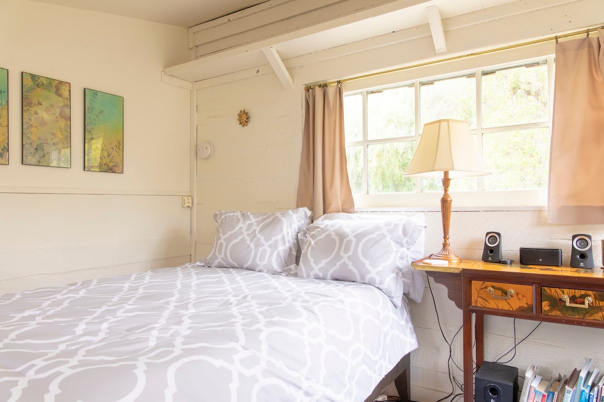 Refugio relajante situado en una exuberante ladera en la tranquila ciudad costera de Stinson Beach. Déjate transportar por el diseño de inspiración asiática y la tranquila ducha exterior y bañera de inmersión. Disfruta de las vistas al mar desde la comodidad de una cama tamaño queen y contempla la puesta de sol desde la privacidad de una terraza de madera. Camina solo cinco minutos hasta tres millas de playa perfecta. Vale la pena el viaje a través de los árboles por las escaleras de piedra irregulares y las escaleras de madera muy empinadas para encontrarte transportado lejos de todo. Una cómoda cama tamaño queen con muchas almohadas ofrece el lugar perfecto para sentarse y mirar a través de las ramas de las copas de los árboles hacia el océano. La pequeña zona de cocina tiene todo lo necesario para cocinar de forma sencilla. Encontrarás mantas adicionales en el armario detrás de un antiguo biombo japonés, mientras que el nuevo biombo shoji hecho a mano oculta el inodoro y el lavabo del baño. La ducha exterior es estimulante (y para los aventureros en la lluvia y el invierno), mientras que la bañera de remojo es más que relajante mientras se mira el océano y se observa cómo el cielo cambia de color al atardecer. Ahhhhh. ¡Buen wifi, linternas para caminar de noche, aromaterapia para relajarse por completo, antifaces para dormir! Me gusta dar a mis huéspedes total privacidad, pero siempre estoy disponible si es necesario (el texto es más fácil). Stinson Beach es una tranquila ciudad costera popular por su surf tranquilo, arena suave y kilómetros de senderos de montaña. El bungalow de playa se encuentra en la ladera de la colina con escaleras de madera y piedra para llegar. Vale la pena el viaje, pero si tienes una rodilla mala, un tobillo complicado o un problema para andar, esta propiedad no es para ti. Se recomienda un coche para excursiones de un día a Muir Woods, la Costa Nacional de Point Reyes, el monte Tamalpais, un viaje en ferry a San Francisco y compras en Sausalito. El Marin Airporter te llevará desde SFO hasta Mill Valley y luego podrás subir al Stage Coach hasta la ciudad. (Consulta el sitio web de Marin Transit). El Stage te llevará por el condado de Marin y sus alrededores. Sin embargo, la mejor manera de desplazarte por nuestra pequeña ciudad costera es aparcar el coche y caminar. Nuestra pequeña ciudad tiene tres restaurantes, uno con pan recién horneado y comida para llevar, una biblioteca, librería, tienda de surf, tienda de alquiler de kayaks y surf, galería de fotografía, tienda de ropa vaquera reciclada y teñida a mano, galerías de arte, joyería, floristería y mucho más. El mercado de Stinson Beach tiene todo lo necesario para una escapada de fin de semana. Querrás hacer una caminata larga o corta por las rutas de senderismo bellamente mantenidas de Matt Davis o Steep Ravine y pasear por las tres millas de arena perfecta de una de las mejores playas del norte de California. Puedes surfear, hacer boogie board, paddle surf, kitesurf o simplemente poner los pies en el agua y maravillarte con la maravilla del océano. Ya sea montaña o mar, aquí en nuestra ciudad costera todo gira en torno a la naturaleza. Los huéspedes deben ser realistas sobre subir escaleras. Si tienes una rodilla o un tobillo que te duela, o un problema para andar, este no es el lugar ideal.