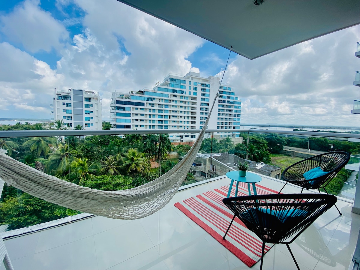 Recién renovado apartamento con vista única al mar y zona de piscinas, aire acondicionado en todos sus espacios, internet de alta velocidad en fibra óptica, ubicado a 5 minutos del aeropuerto, a 10 minutos en taxi de la ciudad amurallada y con acceso directo a las mejores playas de Cartagena, cuenta con gimnasio en las zonas comunes. Ubicado en la zona norte (morros) de hoteles como Holiday Inn, Radisson, Sonesta, Las Americas