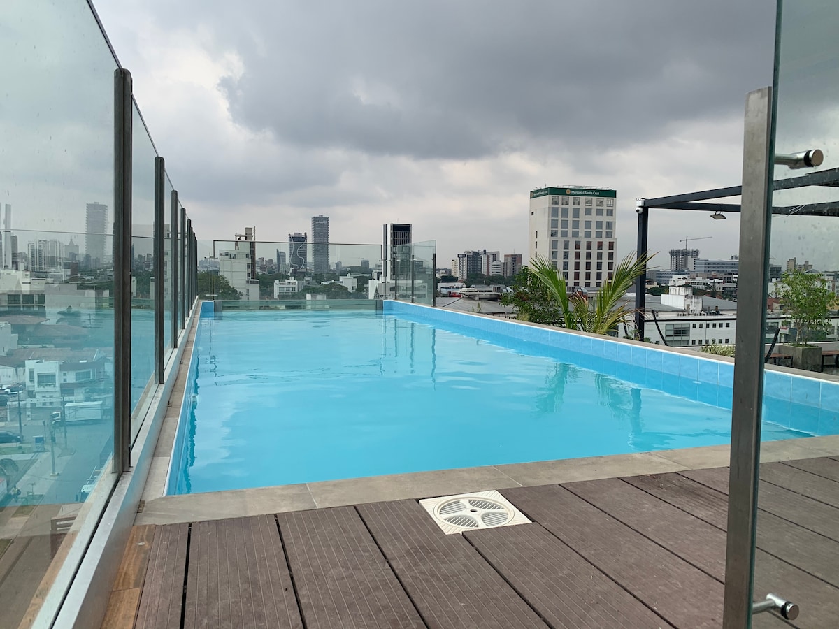 Studio nuevo y moderno en la mejor zona residencial de Santa Cruz ( Equipetrol) con todas las comodidades, en edificio de vanguardia con piscina en terraza, churrasquera, areas de descanso. El Studio esta completamente equipado, con TV Smart, aire acondicionado, baño con todos los accesorios de higiene, cocina con toda la menajeria y diseñado para hacer su estadia confortable y placentera