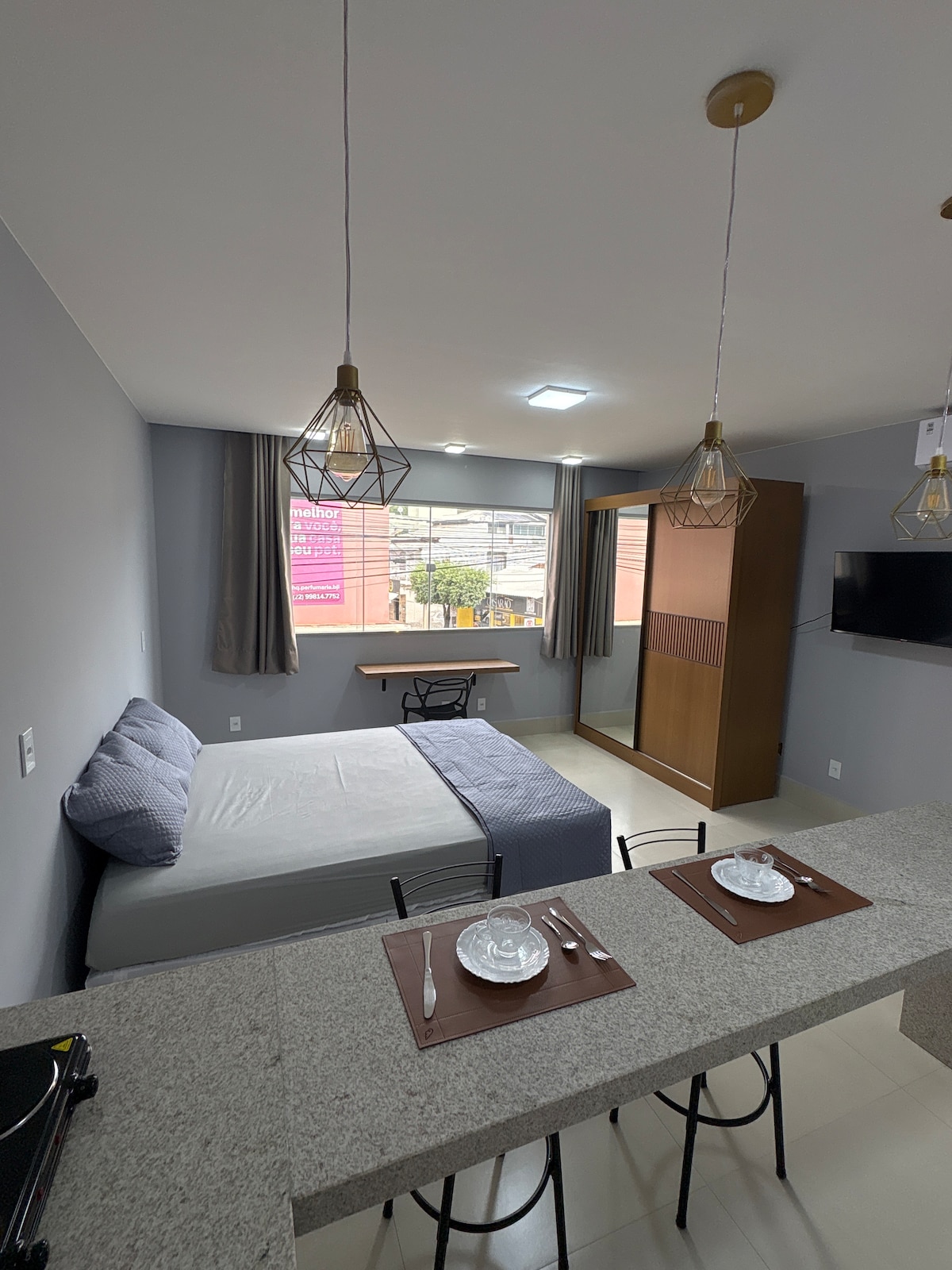 Abrace a simplicidade neste lugar tranquilo e bem-localizado. Estúdio com integração do quarto com a cozinha onde pode fazer um lanchinho assistindo televisão em banquetas altas com muito charme. Ideal para quem está a trabalho ou lazer. Próximo a mercado, farmácia, hospital. Bem no centro da cidade. Uma ótima opção para quem quer conhecer a nossa cidade.