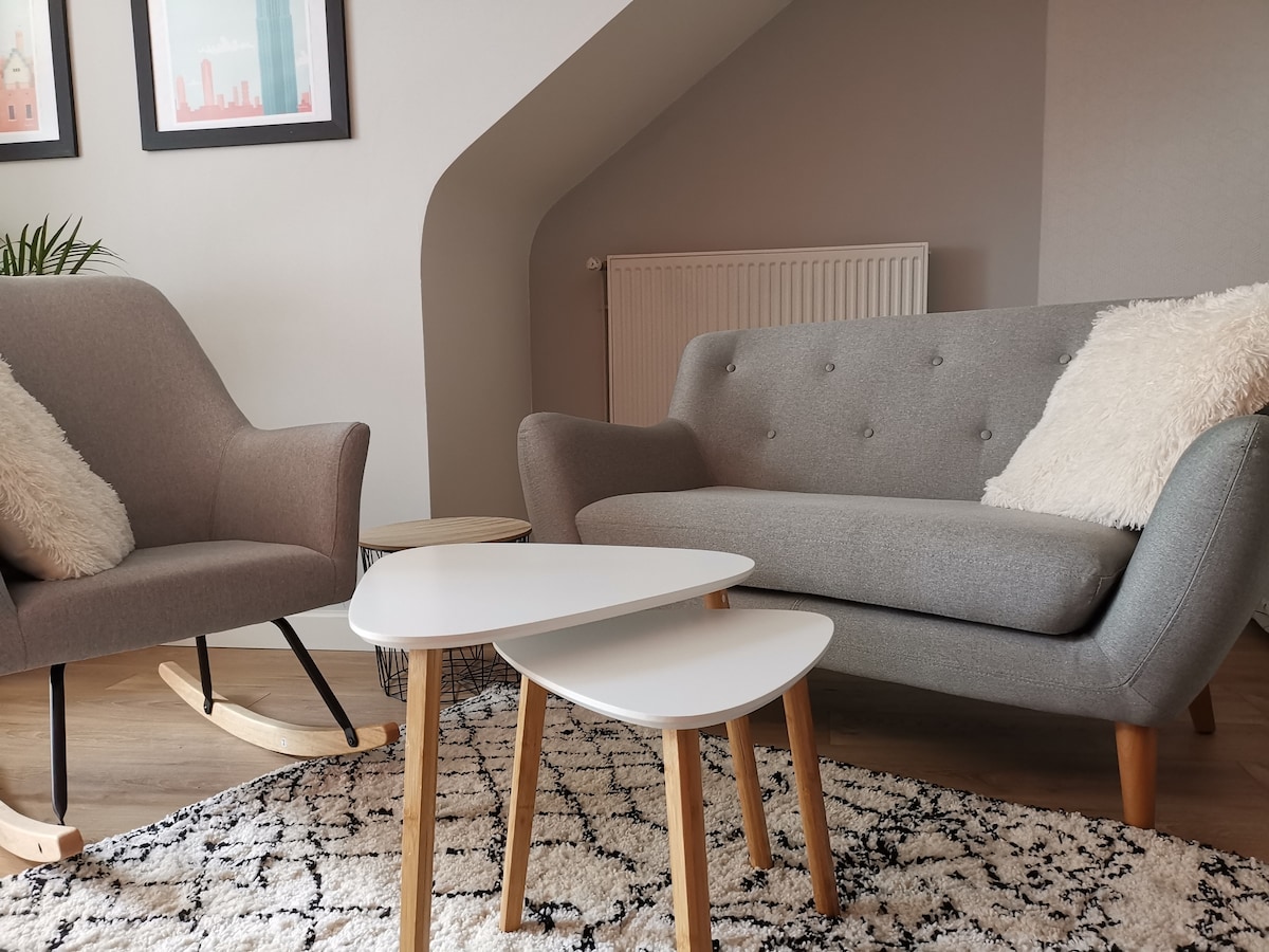 Relájese en este nuevo alojamiento tranquilo a 2 pasos del centro de la ciudad. El apartamento está diseñado para ofrecerle una estancia cómoda y agradable. Con su diseño sobrio y elegante, ofrece un ambiente acogedor. La sala de estar está cuidadosamente amueblada, la cocina está totalmente equipada, encontrará todo lo necesario para preparar deliciosas comidas. La suite ofrece una cama cómoda, así como una ducha, y todo lo necesario para dormir y aseo.