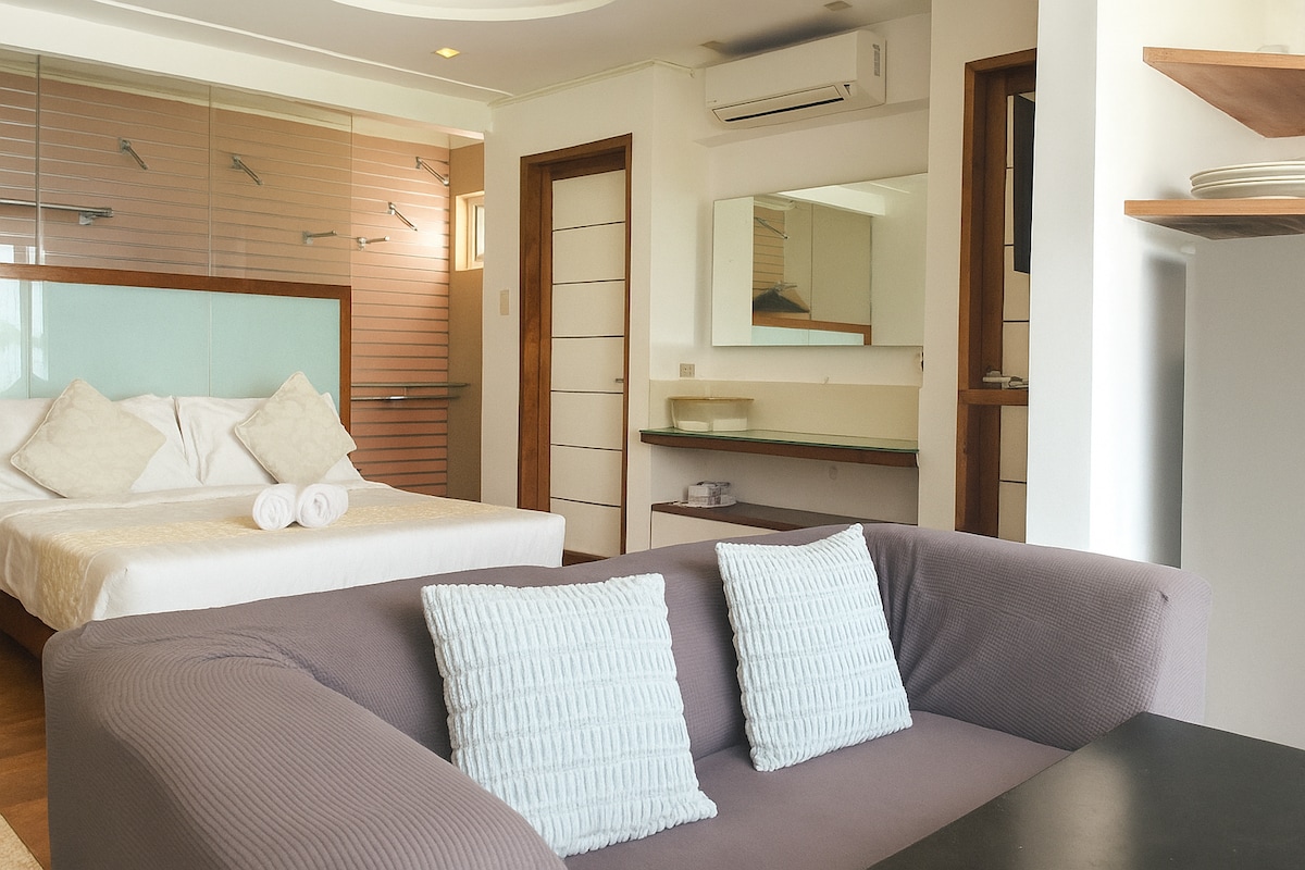 We are located at Station 1, only 1 min walk to beachfront/Starbucks, 5 min walk to Station 2 D'mall, Many restaurants/bars/stores are nearby, convenient location but super quiet area. Our building is named CiNta Hotel, a lovely small hotel, newly opened in 2024. Total 2 story 5 rooms. 3rd floor is rooftop a small restaurant & bar. This room is at 2nd floor, it's suite type with balcony and kitchen, including rice cooker, electricity stove, Pan, kettle, plates, cups, basic cooking equipment.