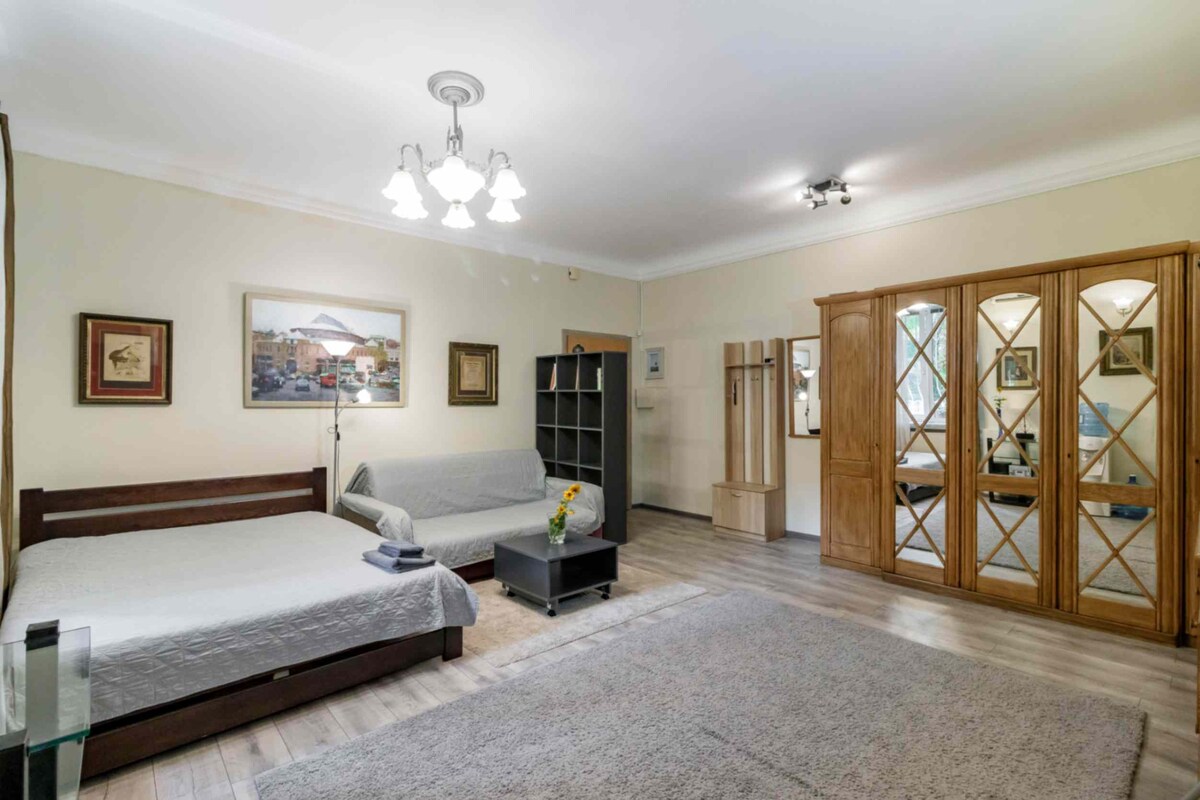 🌿 Tranquil, spacious 48 m² designer studio in leafy Lypky — Kyiv’s historic heart. 🏛️ Prestigious government district — secure and well-protected area. ⚡ Reliable 24/7 electricity with no outages. ❄️🔥 Warm year-round: Cooper&Hunter AC (−25°C to +50°C) + heated bathroom floors. ☕ Fully equipped kitchen & drinking water cooler. 🧺 Washing machine + separate dryer. 🔑 Easy self check-in anytime.
