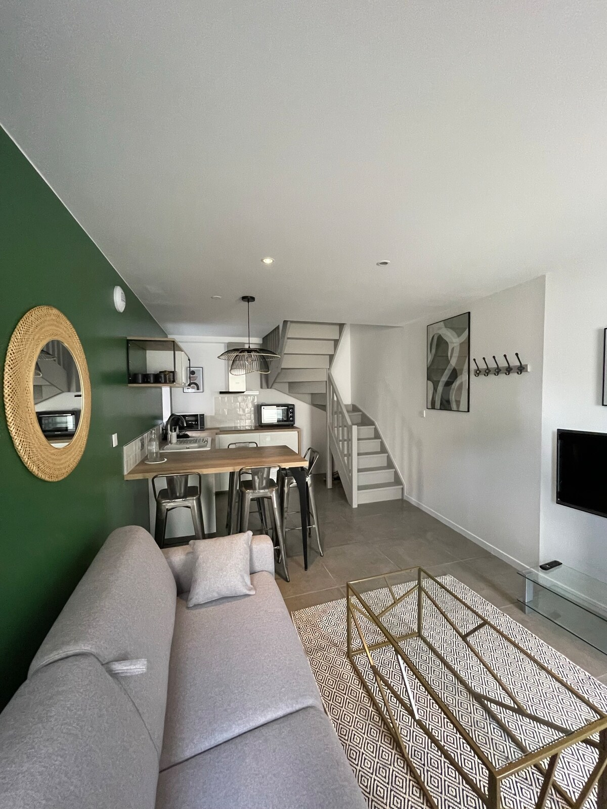 Casa en el centro del pueblo, totalmente renovada y decorada con las tendencias actuales, con una sala de estar con sofá cama de 160 cm y un dormitorio con una cama muy grande de 180 cm, separable en 2 camas de 90 cm, 1 zona de oficina, 1 baño y una cocina equipada. Con una ubicación ideal, todas las tiendas de proximidad están a 1 minuto a pie. Cerca de Clisson, Cholet, Nantes y el parque Puy du Fou (25 min).